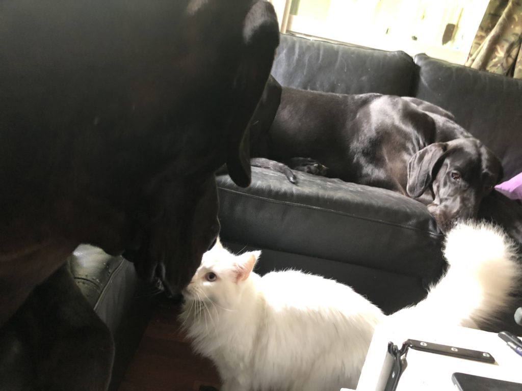 Yökylävierailu meni oikein hienosti. Danny suhtautui esimerkiksi kissoihin pitkän tapaamistauon jälkeen erittäin hyvin ja rauhallisesti. Dannyä ei esimerkiksi haitannut lainkaan tilanne, jossa Lumi yritti kainovienosti kiertää sohvalla makaavan vieraamme sohvan selkänojan kautta, mutta tasapaino petti kriittisellä hetkellä ja kissa mätkähti suoraan Dannyn selän päälle. Danny ei hetkahtanutkaan; sen sijaan Lumilla tuli kiire kiivetä takaisin selkänojalle keräilemään egonsa rippeitä kasaan 😉
