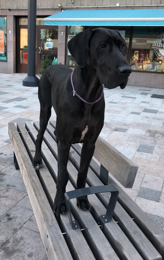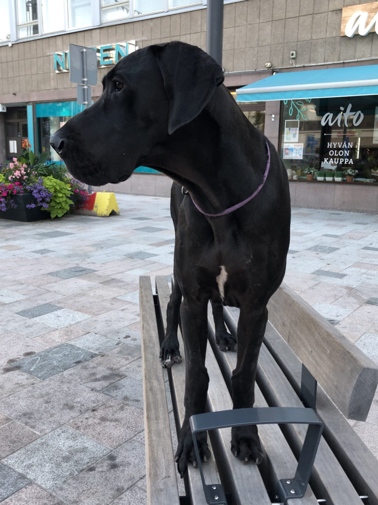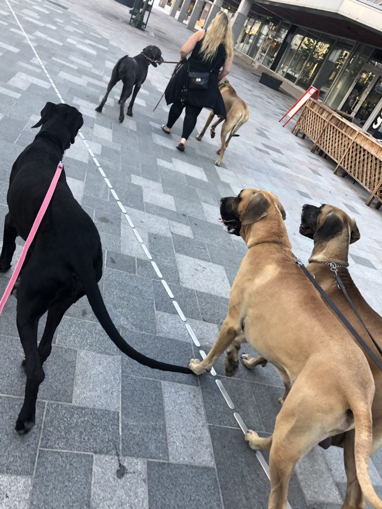Jopa helteiseksi muuttunut elokuinen ilta oli vetänyt kaupungille muutenkin ihmisiä, joten meidän iso koirakokoonpanomme onnistui keräämään huomiota juuri niin paljon kuin olettaa saattaa. Joitakin ihmisiä pysähtyi ja tuli juttelemaan kanssamme pitemmäksikin aikaa, ja koiramme edustivat ihmisten keskellä erinomaisesti. PR-hommat suoritettu onnistuneesti! 🙂
