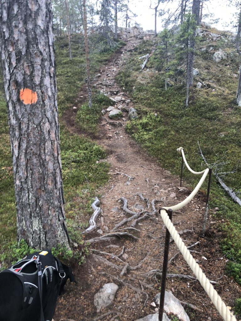 Reitin tasoksi on mainittu vaativa, ja myönnettävähän se on, ettei aivan helpoimmasta taipaleesta ollut kyse. Kivikkoista ja juurakkoista, hyppelehtivää kapeaa polkua vieläpä pienesti nousevassa maastossa. Hauskaa, mutta keskittymistä vaativaa kulkemista.