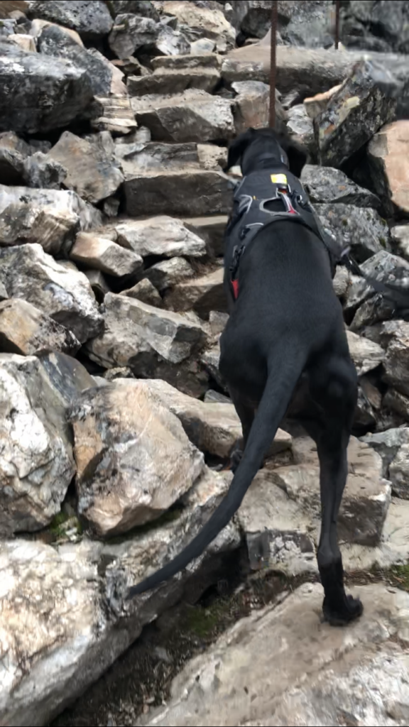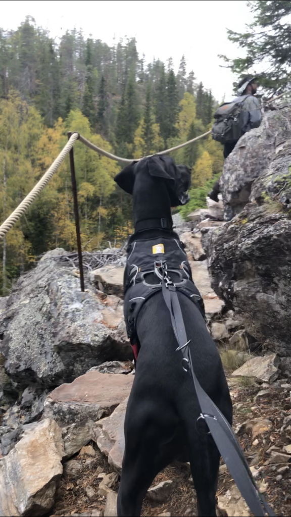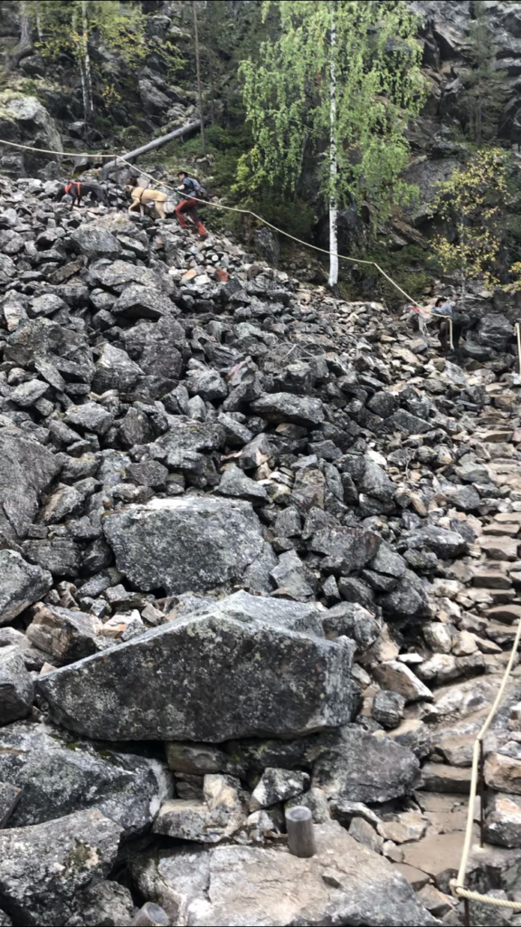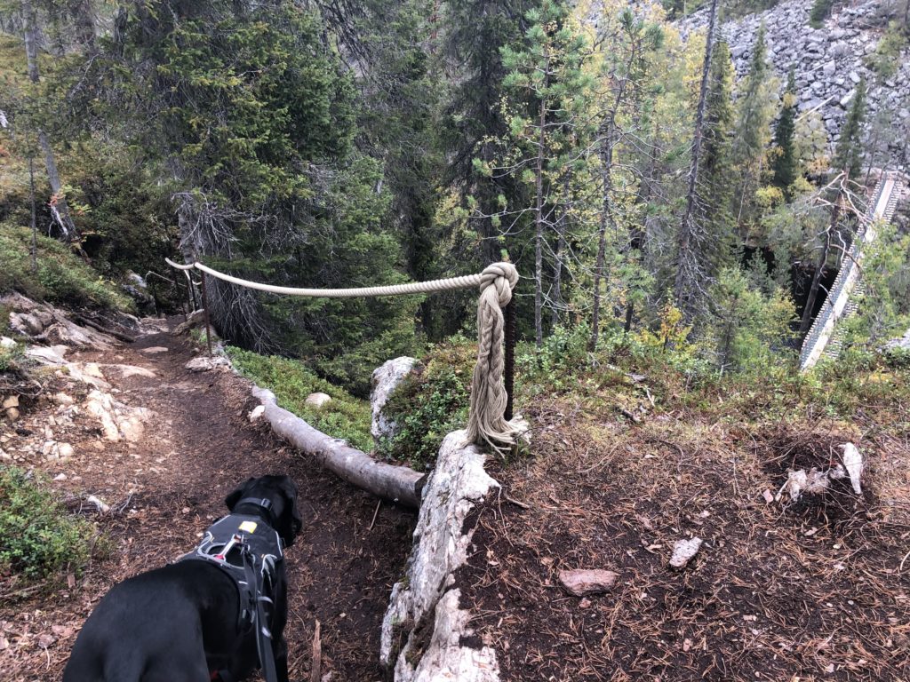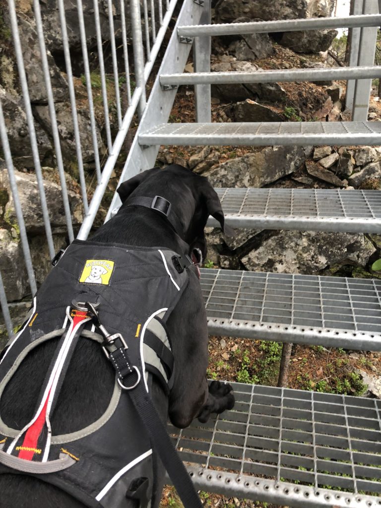 Heti riippusillan jälkeen alkoi kiviportaiden kapuaminen. Paikka on varmastikin alkujaan luonnon muovaama, mutta sitä on varmasti jouduttu ihmisten toimesta muokkaamaan kulkureitiksi sopivaksi. Portaat olivat hienot ja yllättävän raskaat kavuta. Tämä osuus ei luonnollisestikaan tuottanut koirille vaikeuksia.