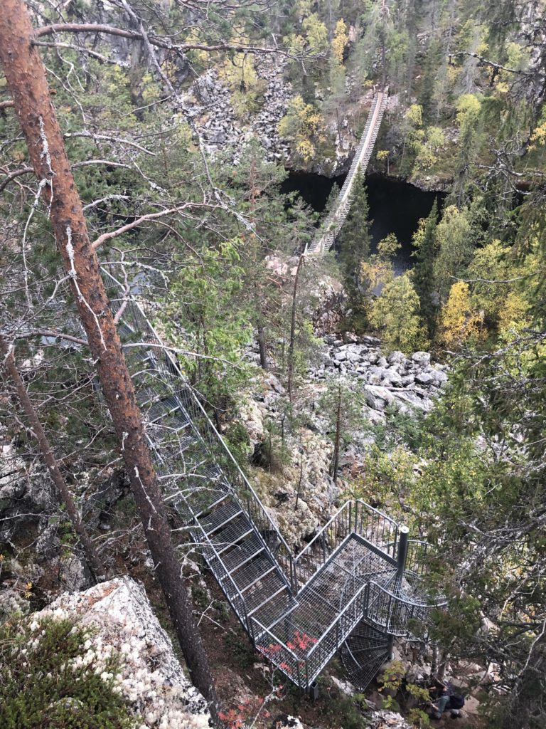 Sitten tuli vastaan se eniten harmaita turpakarvoja aiheuttanut paikka. Teräksiset, läpinäkyvät kierreportaat 1,5 kierroksen kiepillä, ja jatkuivat siitä tasanteena ja lopulta suorina portaina kanjonin reunan laelle.