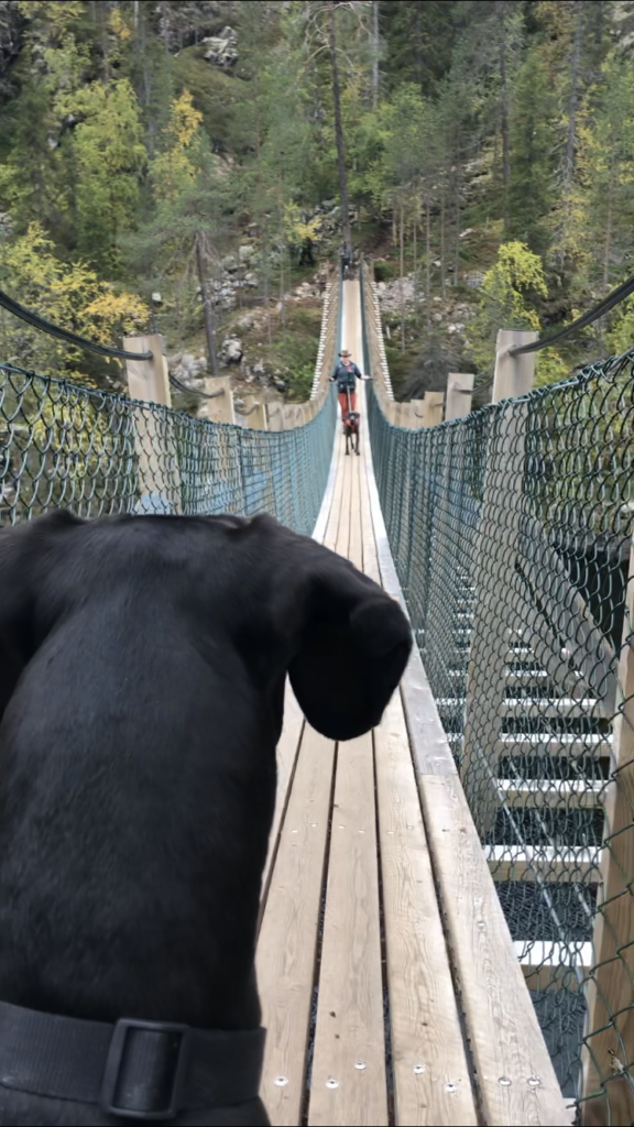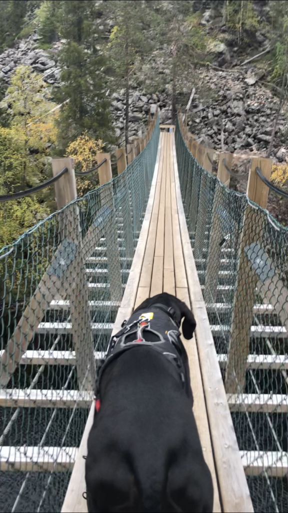 Ensin olisi luvassa riippusillan ylitys, jolla pituutta on viitisenkymmentä metriä ja se roikkuu noin 11 metrin korkeudessa. Nemi ylitti riippusillan paremmin kuin osasin odottaa: alun pienen nikottelun jälkeen se porhalsi takaa edelleni ja askelsi riippusillan yli vallan hienosti! Jäimme odottelemaan loppuseurueen suorituksia kameran kuvatessa kaikkien ylityksiä, ja hienostihan se koirilta (ja ihmisiltä ;D) sujui. 🙂