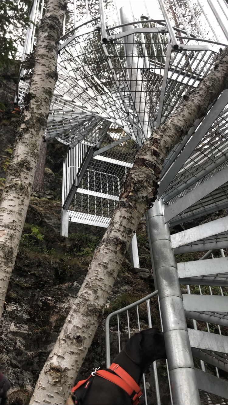 Kuvittelepa miltä tuollaiset ritiläportaat tuntuisivat omien varpaiden alla? (Sattuu, kyllä.) Sitten kun lisätään se, että portaista näkyy läpi (ja matka alas maahan on piiiitkä) ja lisäksi kyseessä on vielä kierreportaat, niin näin isoille ja pitkärunkoisille koirille ei ihan helpoin pala kakkua pureskeltavaksi.