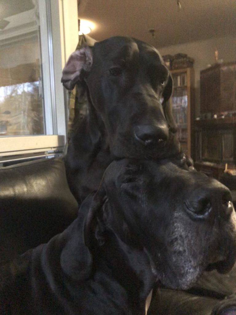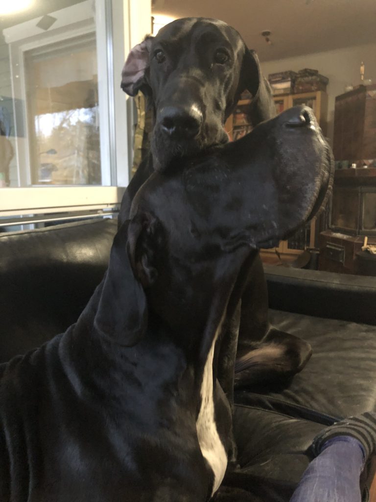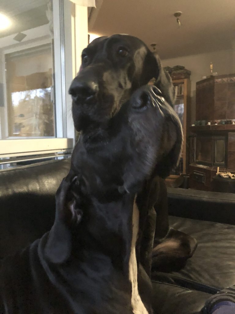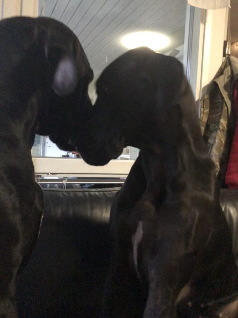 Ja sitten, voi mikä halinalle! Iso, musta, pää painautuu olkapäälleni ja poski painuu vasten omaa poskeani. Luca ihan oikeasti halaa. Jos se ei pääse halaamaan, se aivan varmasti nojaa (koko painollaan), tai sohvalla se tulee mieluusti aika pitkälti pää syliin. Ja jos minä suvaitsen nousta sohvalta, mitä todennäköisimmin se tulee perässäni.