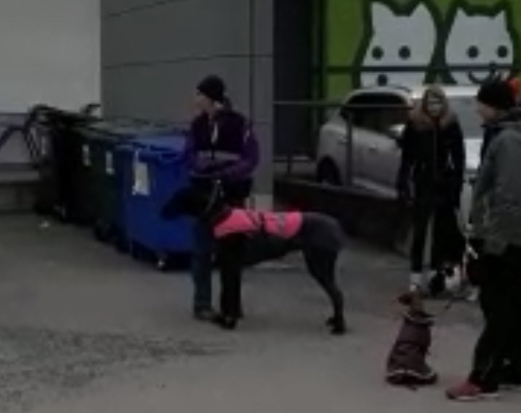 Meidän pienesti metsittynyt Nemi oli ensin aivan ymmyrkäisenä, kun se näki myymälän pihamaalla yhtäkkiä yli parikymmentä koiraa. Se kuitenkin asettui kohtalaisesti, kun sai hetken katsella rauhassa ympärilleen. Kun sitten lähdettiin kävelemään joukon etunenässä, oli Nemillä aika paljon kierroksia. Näki, että tilanne oli sillekin poikkeuksellinen: kuolaa lensi ja koira oli aikalailla jousilla. Nameja se otti kyllä vastaan, mutta aika hätäisesti eikä korvat meinanneet löytyä päästä oikein millään. Kuitenkin, kaiken sen kouhkaamisen ja vouhkaamisen keskellä sen flow oli joka tapauksessa ystävällinen – vain vähän liian vauhdikas, vähän liian nopealiikkeinen ja vähän liian… ISO tehdäkseen mitään noista edellä mainituista asioista. 😀 Kyllähän sekin onneksi rauhoittui lenkin edetessä, mutta alun töyhötys oli tosiaan luokkaa “60-kiloinen, iloinen, 2,5-vuotias tanskandoggin pentu“! …Riittikö kuvaamaan riittävästi?