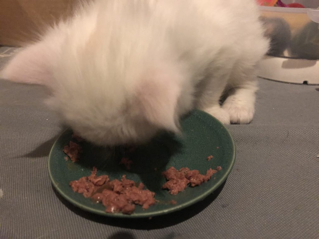 Märkäruokaa, sen puoleen kuin turvotettua nappulaakaan nämä eivät millään halua ruveta syömään. Hyneman söi yhtä märkäruokalaatua – vuorokauden kokonaisannoksena huimat 2 teelusikallista tätä märkäruokaa – on vähän pieni annos noin niin kuin yli puolikiloiselle kasvavalle pennulle. Kahta muuta testaamaani märkäruokalaatua hän ei suostunut syömään. Adam sitten? Hän ehkä suostuu vilkaisemaan märkäruokalautaselle, mutta kävelee sitten teatraalisesti pois. Lähin kosketus on ollut, kun Adam marssii märkäruoka-annoksesta Tietoisesti Ohi, tasapaino horjahtaa juuri väärässä kohdassa ja pentu mätkähtää annoksen päälle kyljelleen… 😀