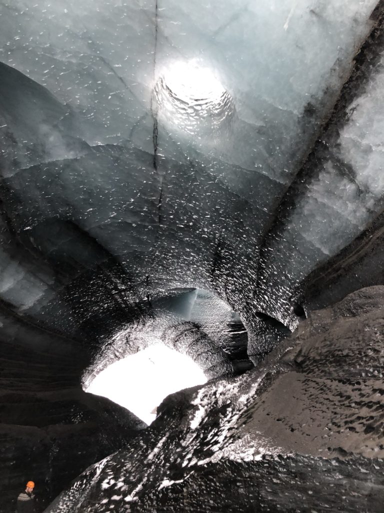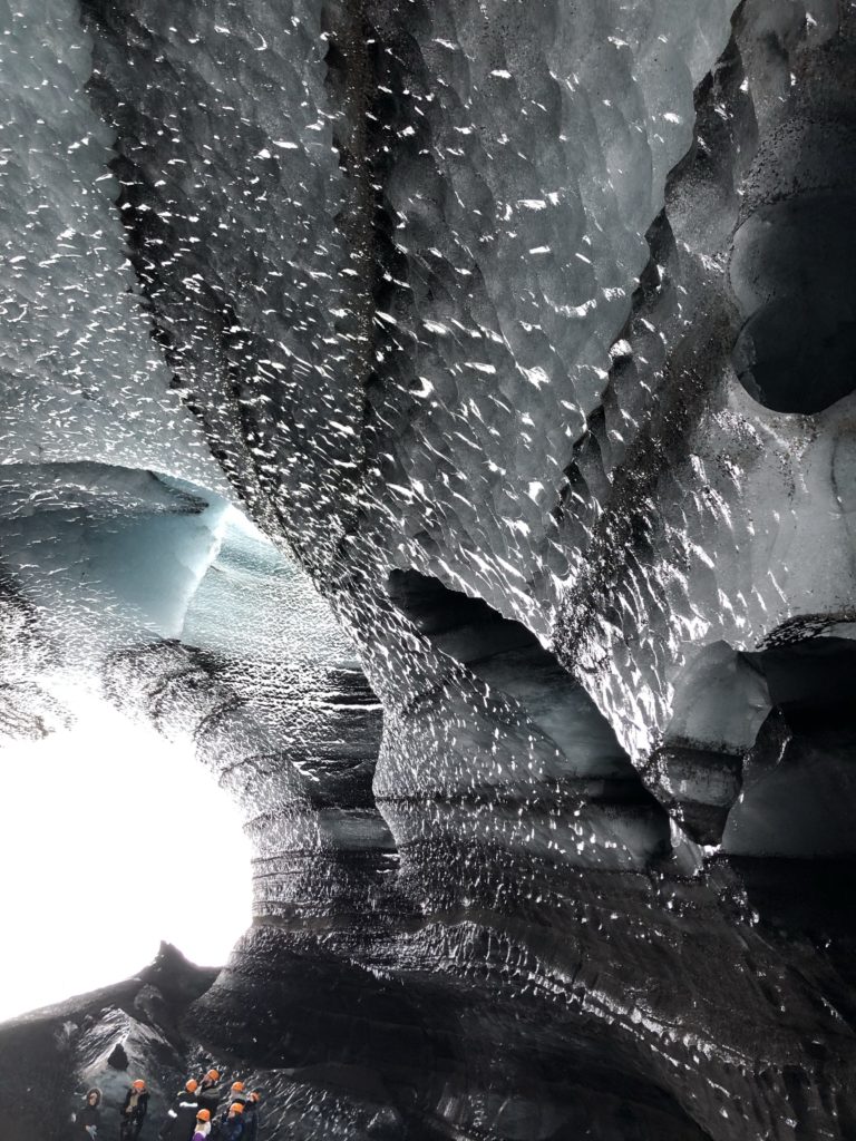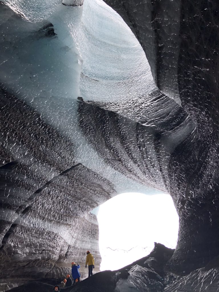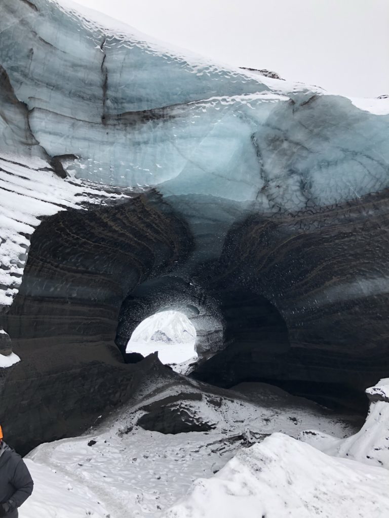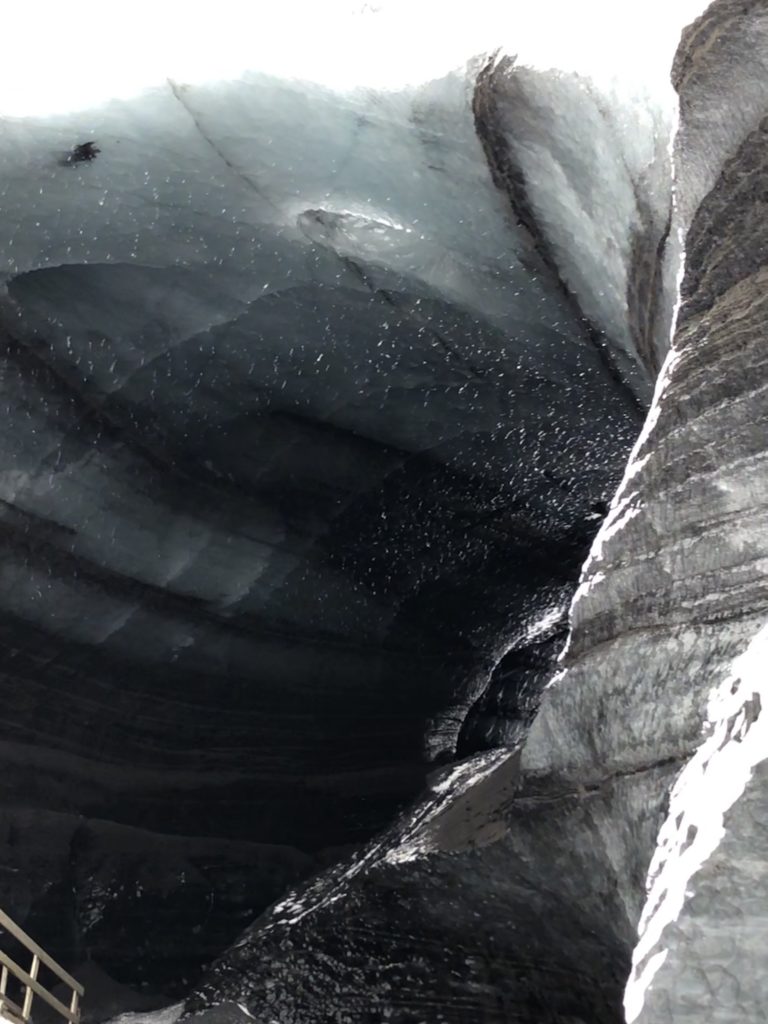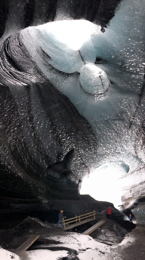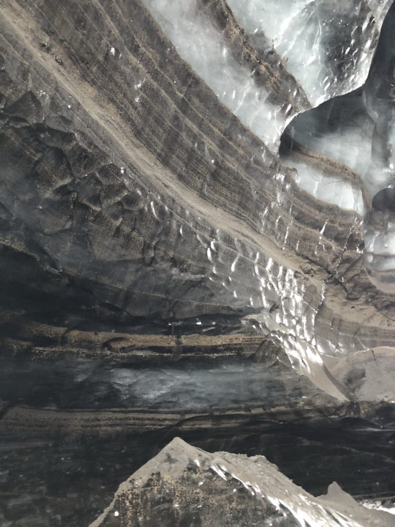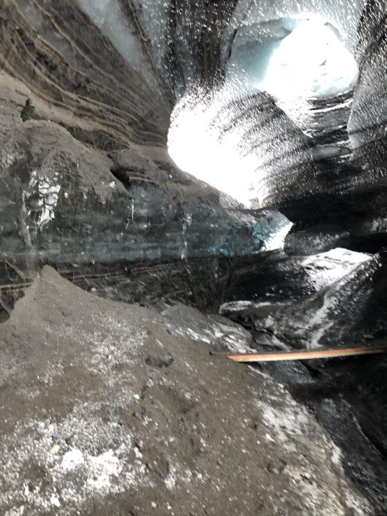 Useat eri värikerrostumat kertoivat omaa kieltään jään sulamisen vaiheista ja samalla jään iästä. Jääluola lähtee muodostumaan jäätikön sulamisvesistä. Jäähän tulee pieni halkeama, johon vettä alkaa kertymään ja pian siihen muodostuu jääluola. Tähän tapaan muodostuvat myös jääluolan kattoon ilmestyneet reiät. Oppaamme osasi kertoa, että uusia luolia turistien ihmeteltäväksi etsitään sulamisvesien puroja seuramalla. Tämä tunneli on löydetty noin 18 kk sitten, ja läpikuljettavaksi asti se on sulanut noin 8 kuukautta sitten. Parissa vuodessa tätä kyseistä jääluolaa tuskin enää on olemassa, vaan se on ehtinyt sulaa jo kokonaan pois. Jään sulamisen nopeus on surullista ja vähän pelottavaakin mietittävää.