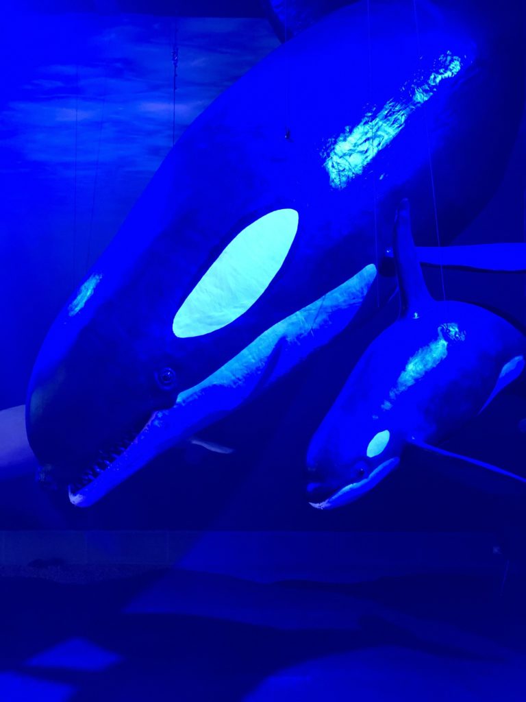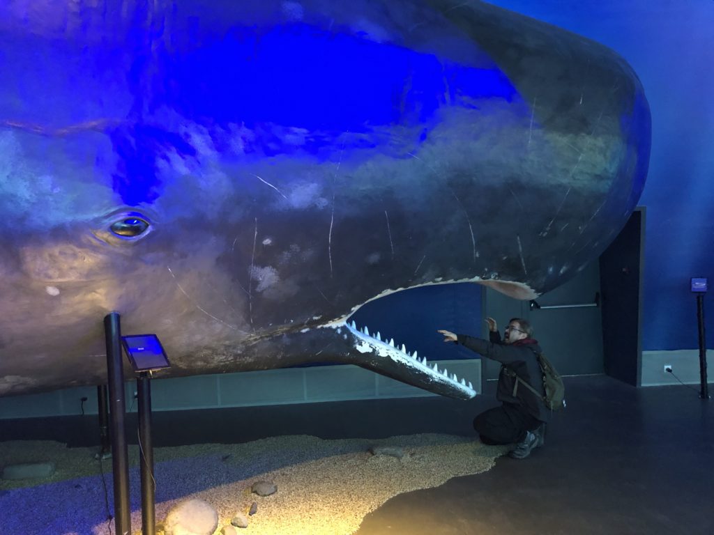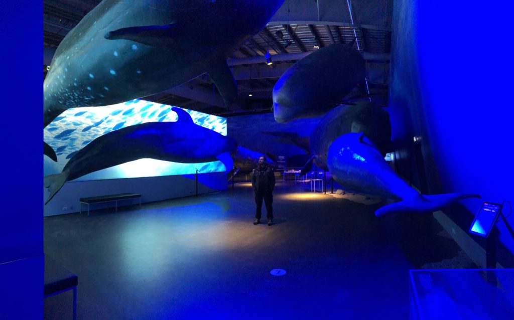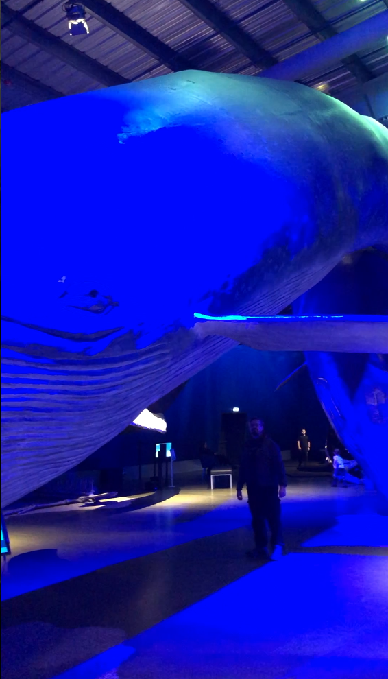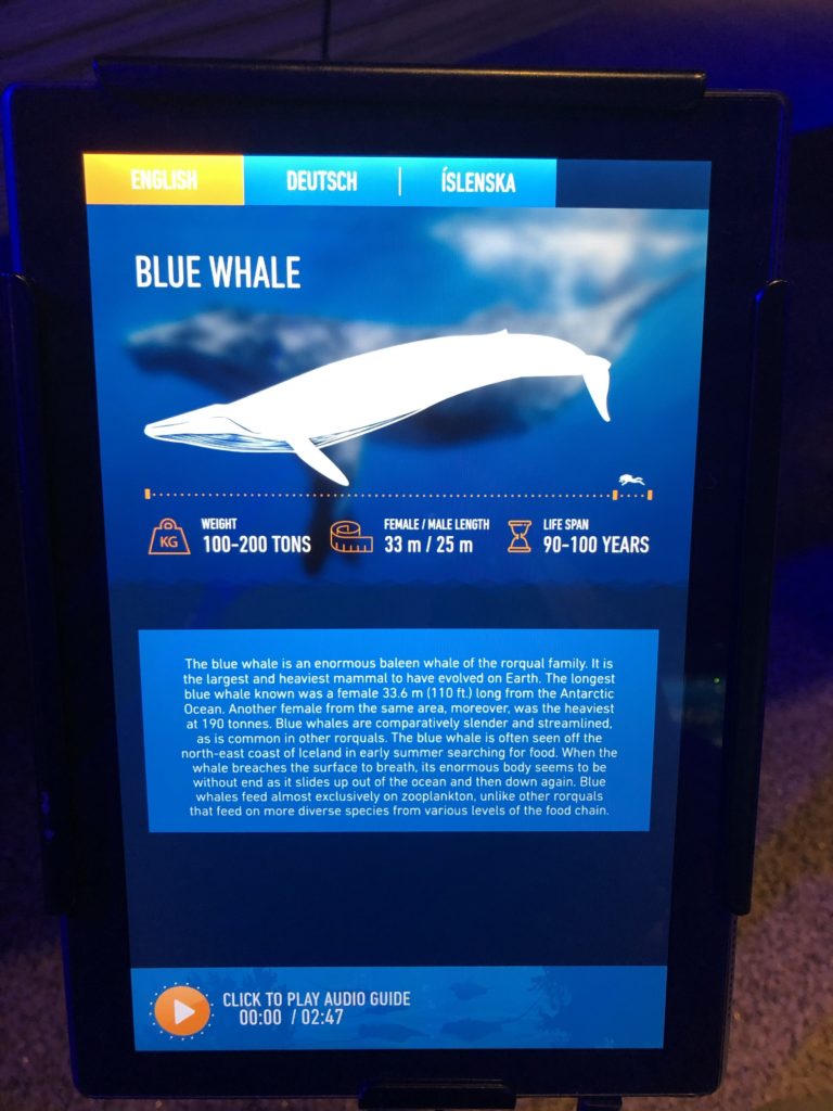 Seuraavaksi ehdimme suuntaamaan juuri sopivasti Whales of Iceland-museoon, jossa esitellään Islannin vesillä näkyviä valaita. Valaista oli tehty kattavat ja selkeät tietopaketit, ja tietenkin mikä hienointa, esillä oli näistä kavereista luonnollisessa koossa olevat mallit. VAU. Onhan se “muutaman metrin” pituinen sinivalas nyt aika näyttävä näky kaikkinensa. Mittavaakasta kertonee myös jotakin se, että joka ikinen kuva, jossa valas näkyy kokonaan, piti ottaa panoraamakuvana. Ne eivät yksinkertaisesti mahtuneet kuvaan yhdellä kertaa. Valitettavasti kuvien sävy on tuollainen läpipalanut sininen – museossa vallitsi vahva sininen valaistus, joka oli teemaan hienosti sopiva, mutta äärimmäisen hankala kuvia ja videokuvausta ajatellen.