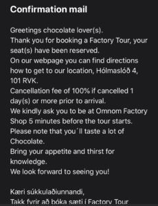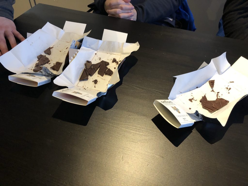 OmNomin kierroksella “brand ambassador” kertoi ja esitteli meille, miten suklaa ja Suklaa eroavat toisistaan ja miten suklaita maistellaan. Kierros oli hyvin opettavainen, ja se sisälsi miellyttävän määrän erilaisten suklaiden maistelua ja keskustelua niiden eroista. Todella opettavainen oppitunti! Hmmm… Ollapa töissä puhumassa suklaasta, myymässä suklaata, maistelemassa suklaata ja tämä kaikki vielä Islannissa…. Hmmmmmmm…. Mun unelmaduuni on tainnut löytyä! 😀