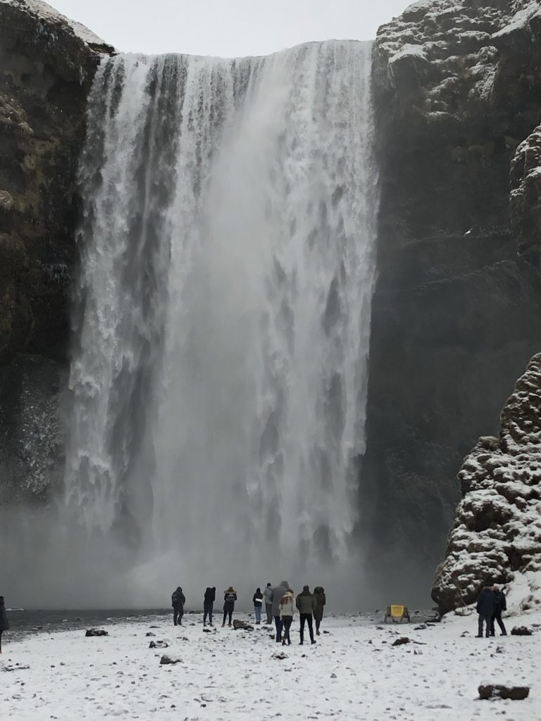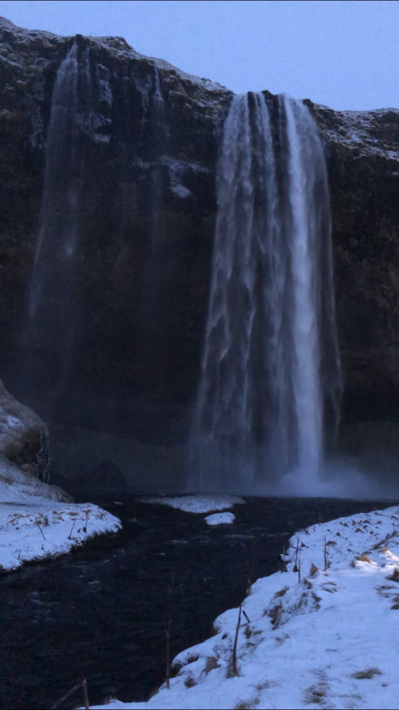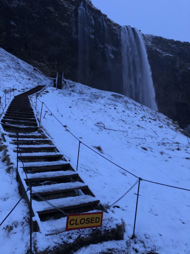Seljalandsfoss on ehkä virtaukseltaan pienempi putous, mutta mielestäni hauskempi, sillä sen taakse pääsee kävelemään! Harmikseni jouduin huomaamaan, että pääsy putouksen taakse on näin talvisaikaan estetty – ja kun nyt asiaa mietin, se lienee ihan hyvä ja turvallinen päätös. Vesi, vesihöyry ja talvipakkaset yhdessä voivat muodostaa turhan monelle turistille kohtalokkaaksi muodostuvan yhdistelmän. Eikä pieni haaveri kovin kaukana ollut minullakaan, kun onnistuin liukastumaan vesiputouksen edessä olevalla puisella sillalla (terveisin nimimerkki “Ranne edellä tatamiin, mustelmasta rakentuu vielä hieno!”).