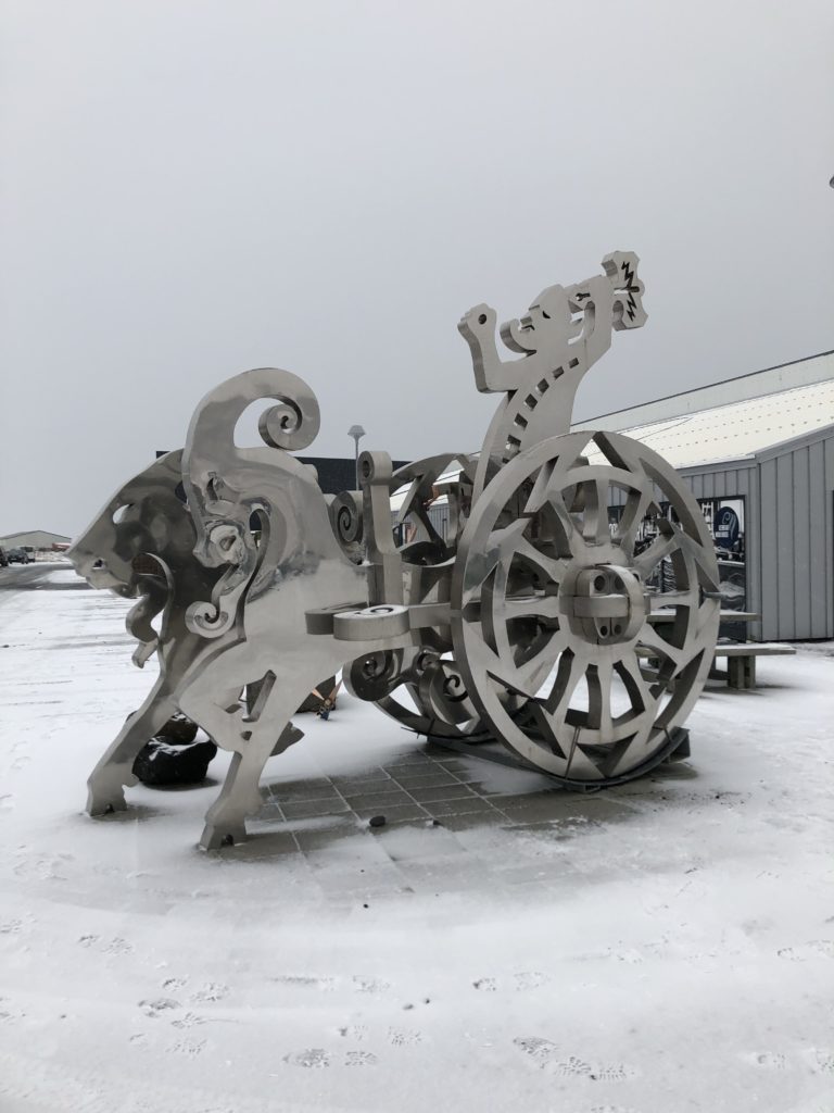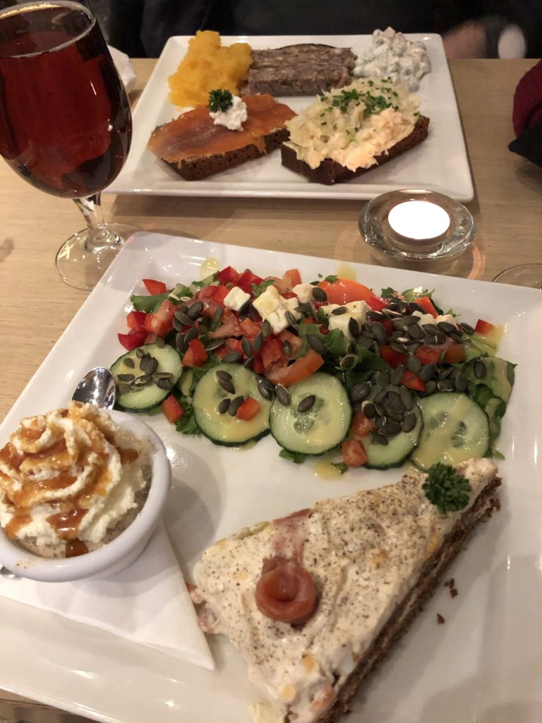 Vikin kaupunkiin oli ilmestynyt uusi patsas Thorista vuohivankkureineen, ja illalla syötiin Cafe Loki -ravintolassa islantilaisia herkkuja: Mikon annoksessa (takana) mm. plokkifiskuria eli eräänlaista kalapyttäriä ja lampaanpäähyytelöä; omalla lautasellani kalatäytteinen leipä sekä ruisjäätelöä (karamellisoituine kermavaahtoineen maistui muuten aika paljon jäädyteltytä mämmiltä!). Annokset olivat nimiltään Thor ja Freyja. Tiettyä symboliikkaa havaittavissa tämän maan nimistössä ja kulttuurissa ;), me tykätään!