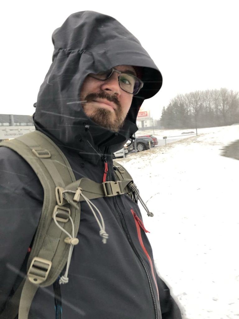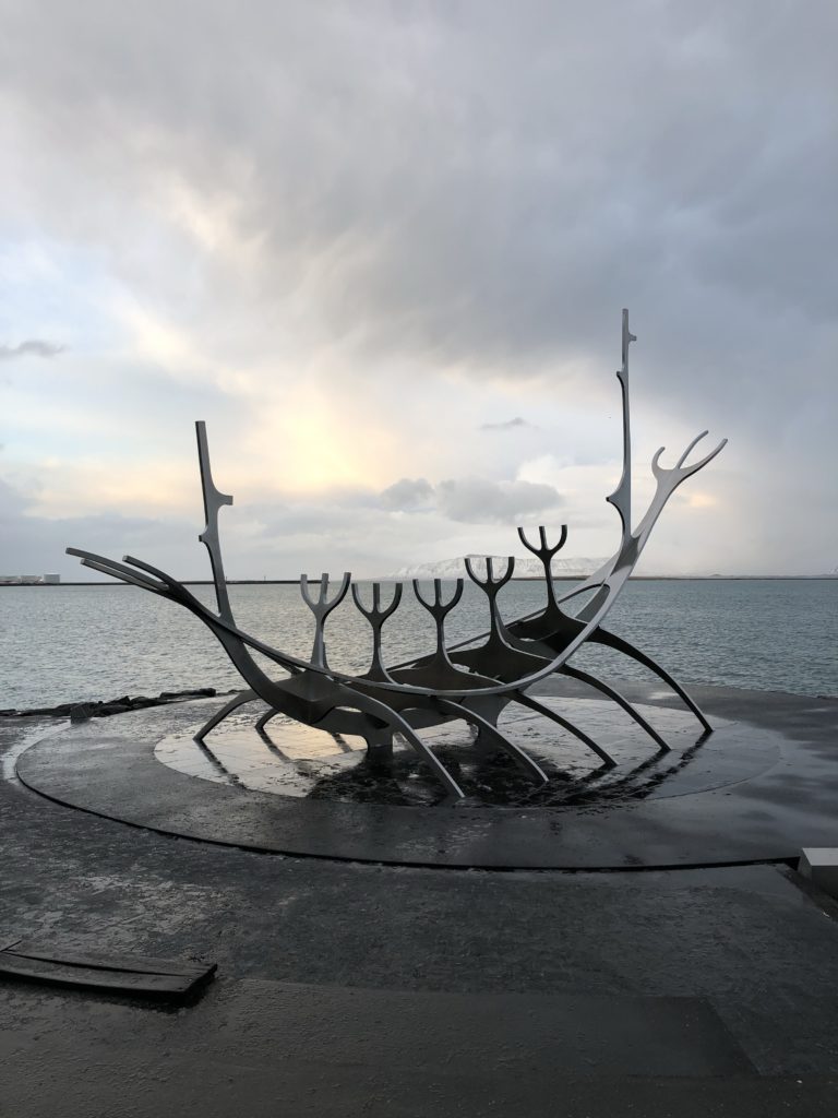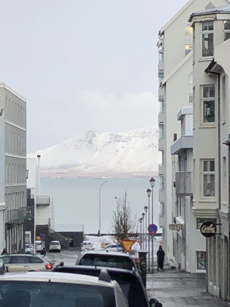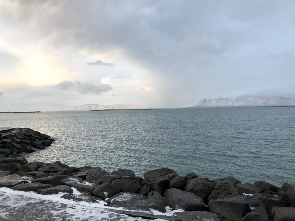 Islannissa, kuten monessa muussakin karumpien olosuhteiden (saari)valtioissa, vallitsee sään suhteen tuttu sääntö: jos vallitseva sää ei miellytä, odota viisi minuuttia ja päätä sitten uudestaan. Vaihtelevat sääolosuhteet pitivät kutinsa: kävelymatkallamme Kringlanista takaisin keskustaan saatiin kokea tuulen lisäksi veden eri olomuodot kaikissa eri kiinteissä muodoissaan (rae – jäinen hyhmä -märkä tiskirätti – lumihiutale…), mutta keskustaan ennättäessämme taivas kirkastui auringonpaisteeksi asti ja näytti meille hetken aikaa parastaan. Lahden toisella puolella oleva Esja-vuorikin tuli viimein näkyviin pilvien ja sumun keskeltä.