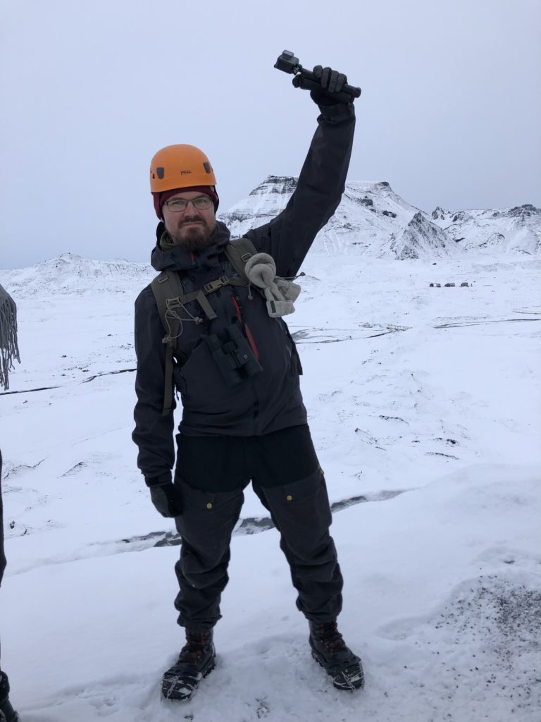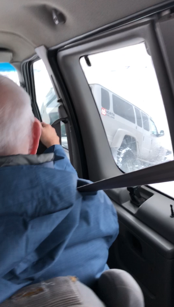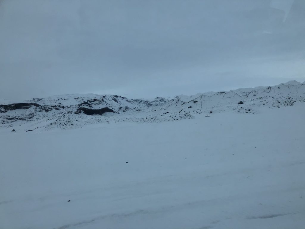 Vesiputoukset olivat meille tosiaan entuudestaan tuttuja kohteita. Toki se ei vähennä tälläkään kertaa niiden hienoutta, mutta ehkä uutuusarvoa ja wow-efektia kuitenkin hieman. Upeitahan ne ovat, aina. Päivän kohokohta ja reissun päämäärä oli kuitenkin jääluola Kötlujökull (lausutaan Kötlujökutl; kaksoisällä lausutaan aina “tl”) -jäätiköllä, joka on osa tai ‘valuma’ isompaa Myrdalsjökull-jäätikköä. Ryhmämme hyppäsi paksuilla läskirenkailla varustetun maastokelpoisen Fordin kyytiin, joka hetken asvalttiajelun jälkeen kurvasi keskelle pienen lumikerroksen peittämää laavakenttää. Sitten olikin luvassa melko töyssyistä off-road -ajelua!