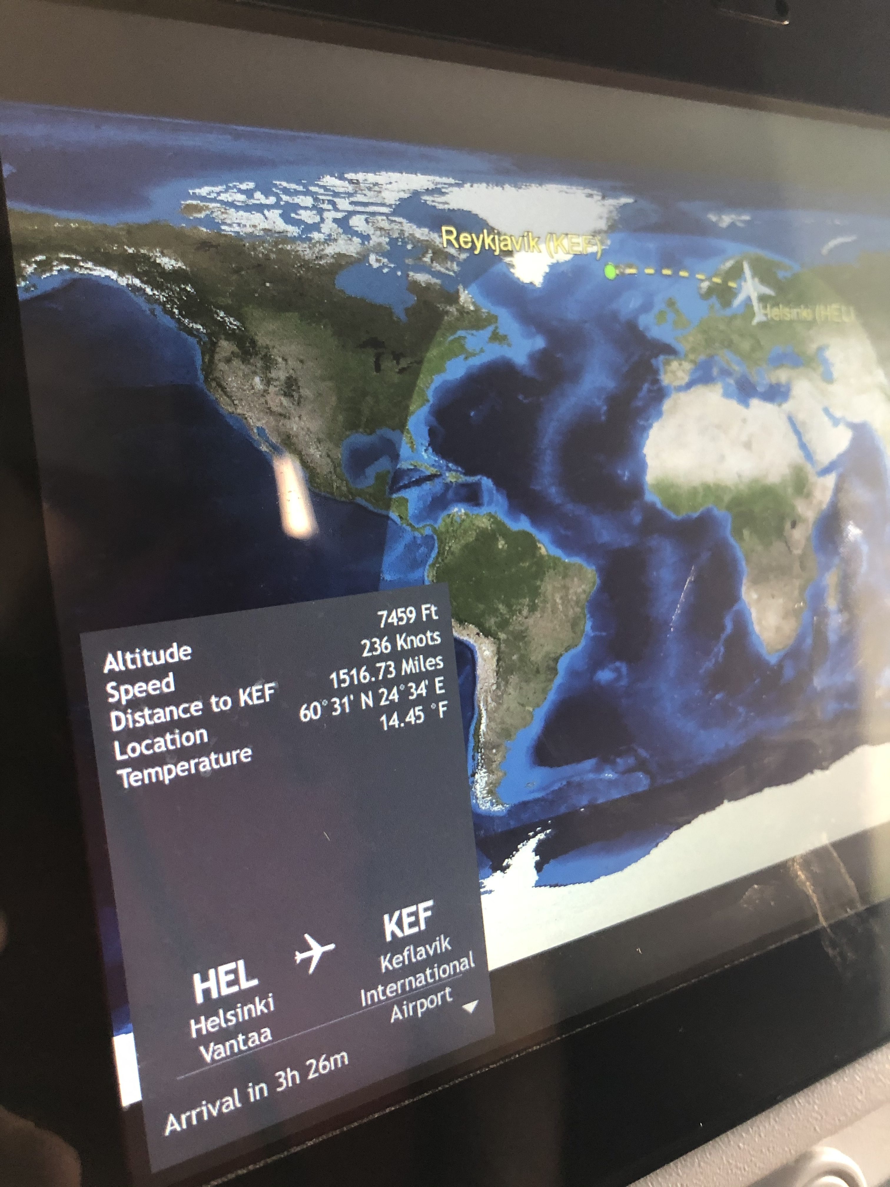 Kolmen ja puolen tunnin mittainen lentomatka Keflavikin lentokentälle meni nopeasti ja mukavasti. Islannin päässä laskeutumista aloittaessamme miehistö kertoi kuulutuksella, että tuulta on luvassa. Laskeutuminen sujui kuitenkin mukavasti pientä tuulen tuntua lukuunottamatta – vain juuri ennen maakosketusta kone teki pienen heilahduksen sivulle, mutta sekään ei ollut mitenkään ihmeellinen. Kone rullasi kentälle, mutta meitä ei päästetty ulos. Pian kuulutettiin, että meidän kannattaa istua takaisin alas, sillä kovan tuulen vuoksi kone ei pääse kiinnittymään tunnelitelineeseen ja
