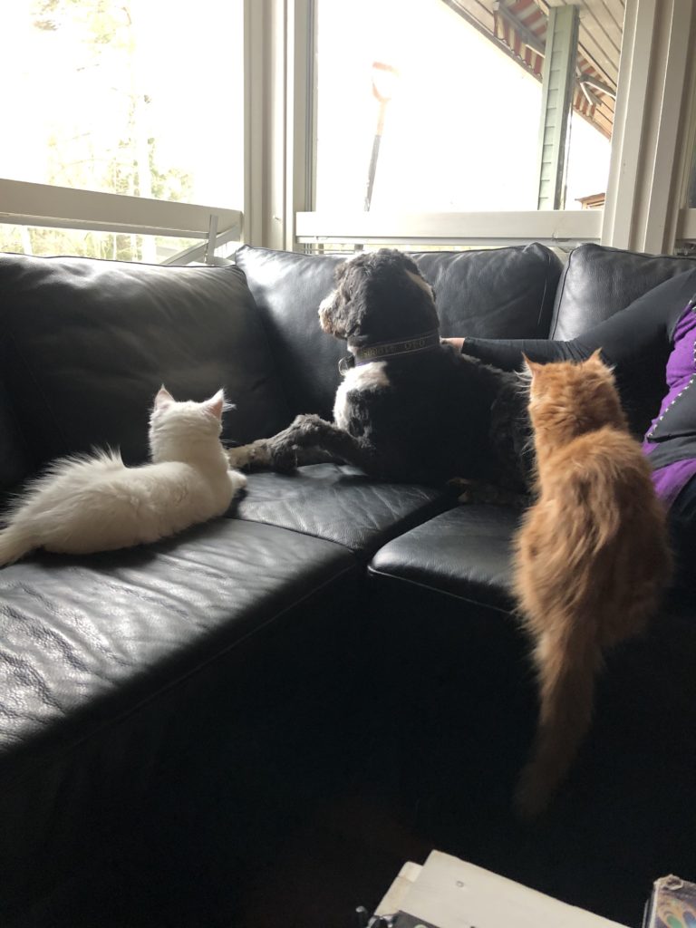 Koiran kohtaaminen oli vähän jännempi juttu. Anselmi-koira on omassa kotonaankin tottunut kissoihin, mutta sitä tuntui myös jännittävän nämä vieraat kissat. Ja kun pentujen ensireaktiot katsekontaktissa olivat sähinää, istui keskikokoinen koira alas huuliaan lipomaan: “sori sori sori, mä en oo täällä!” Pentujen ensireaktiot olivat mielestäni ihan hyvät. Valkoinen poika jähmettyi paikalleen istumaan ja naulitsi puolentoista metrin päässä olevan koiran katseensa alle. Ei merkkiäkään pakenemisesta tai perääntymisestä. Punainen poika reagoi koiran liikehdintään pakenemalla olohuoneeseen tuolin alle, mutta tuli sieltä hyvin pian takaisin ja minun kropan taakse uteliaana katsomaan. Näitä piiloutumisia tapahtui pari, kolme, mutta joka kerta pentu tuli nopeammin takaisin ja palasi aina lähemmäs koiraa. Uteliaisuus ja rohkeus voitti pelon.