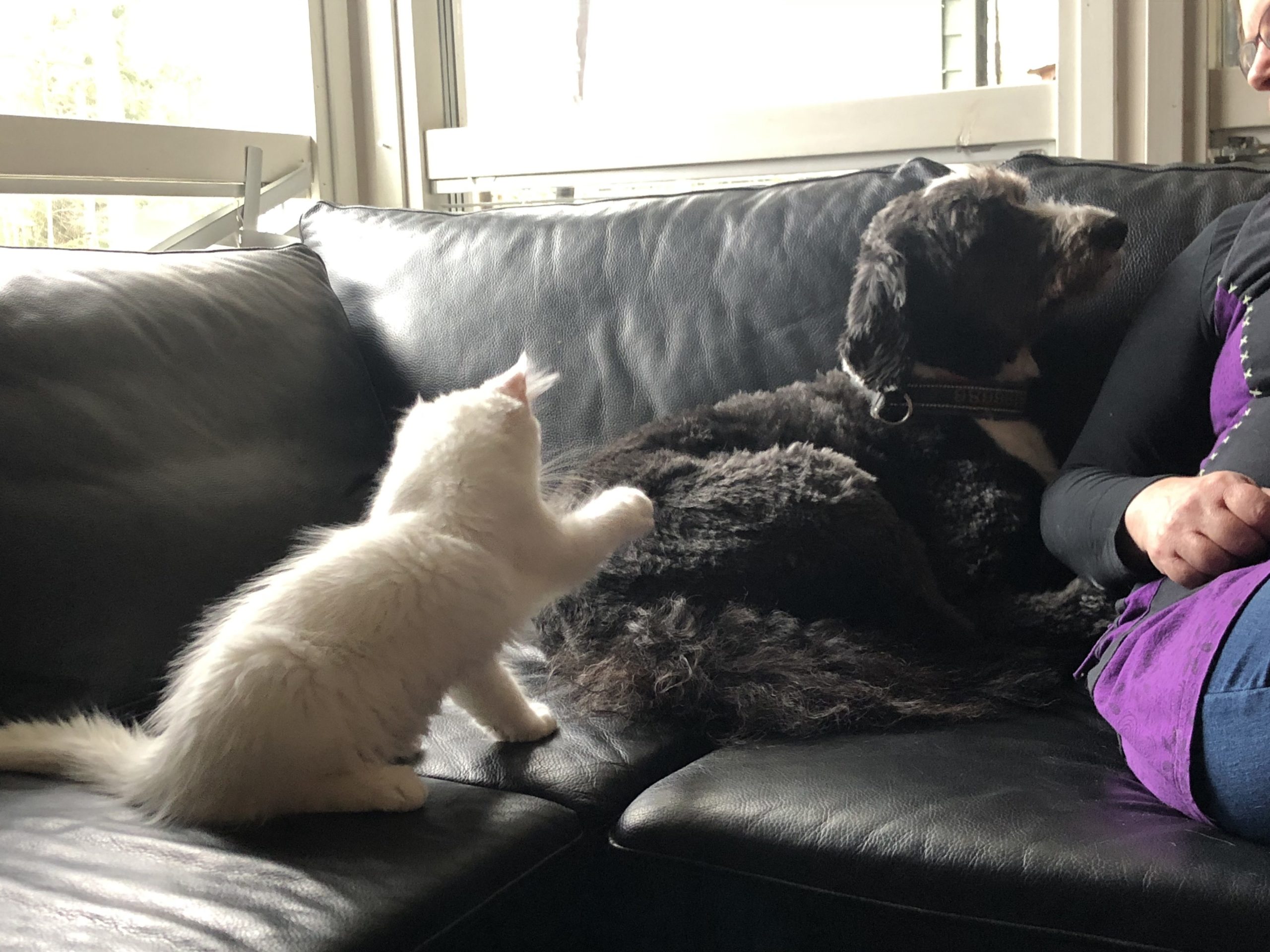 Koiran kohtaaminen oli vähän jännempi juttu. Anselmi-koira on omassa kotonaankin tottunut kissoihin, mutta sitä tuntui myös jännittävän nämä vieraat kissat. Ja kun pentujen ensireaktiot katsekontaktissa olivat sähinää, istui keskikokoinen koira alas huuliaan lipomaan: “sori sori sori, mä en oo täällä!” Pentujen ensireaktiot olivat mielestäni ihan hyvät. Valkoinen poika jähmettyi paikalleen istumaan ja naulitsi puolentoista metrin päässä olevan koiran katseensa alle. Ei merkkiäkään pakenemisesta tai perääntymisestä. Punainen poika reagoi koiran liikehdintään pakenemalla olohuoneeseen tuolin alle, mutta tuli sieltä hyvin pian takaisin ja minun kropan taakse uteliaana katsomaan. Näitä piiloutumisia tapahtui pari, kolme, mutta joka kerta pentu tuli nopeammin takaisin ja palasi aina lähemmäs koiraa. Uteliaisuus ja rohkeus voitti pelon.