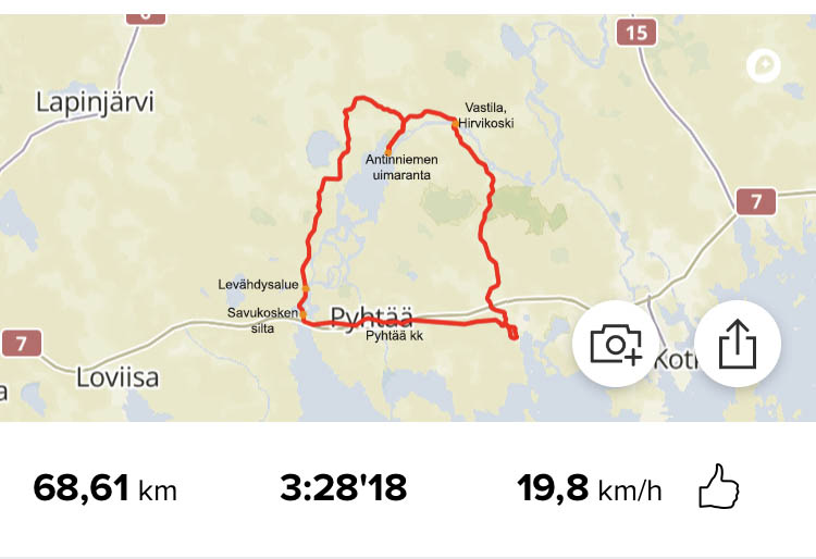 Loppupäätelmänä siis matkaa kertyi näppärät 68,61 km. Aktiivista ajoaikaa oli 3h 28 minuuttia, mutta koko reissuun kului taukoineen, karttojen ihmettelyineen ja maisemien ihailuineen aika tasan 6 tuntia.