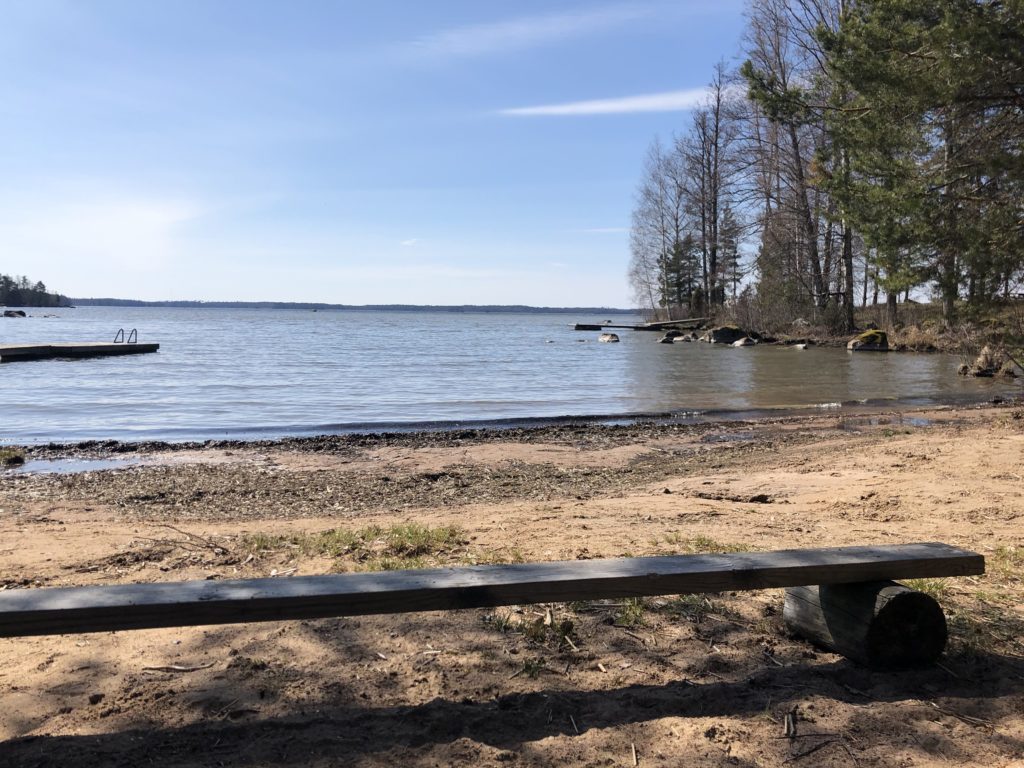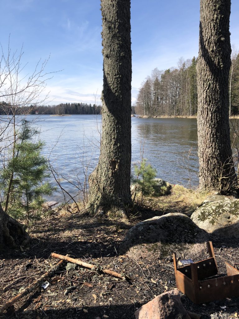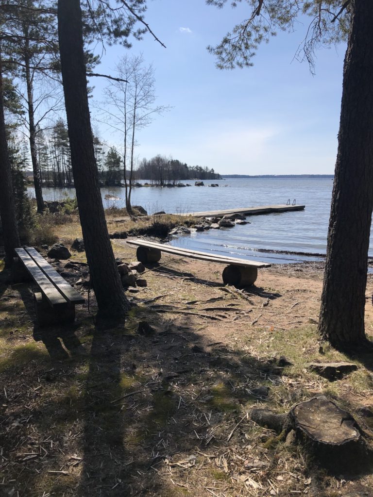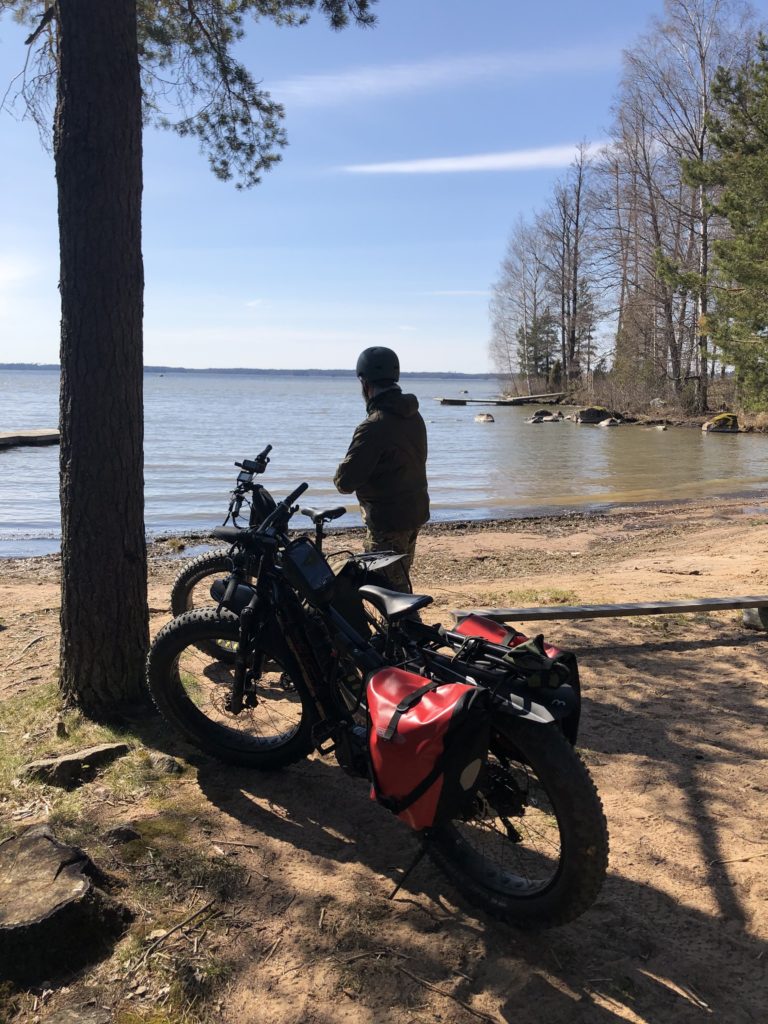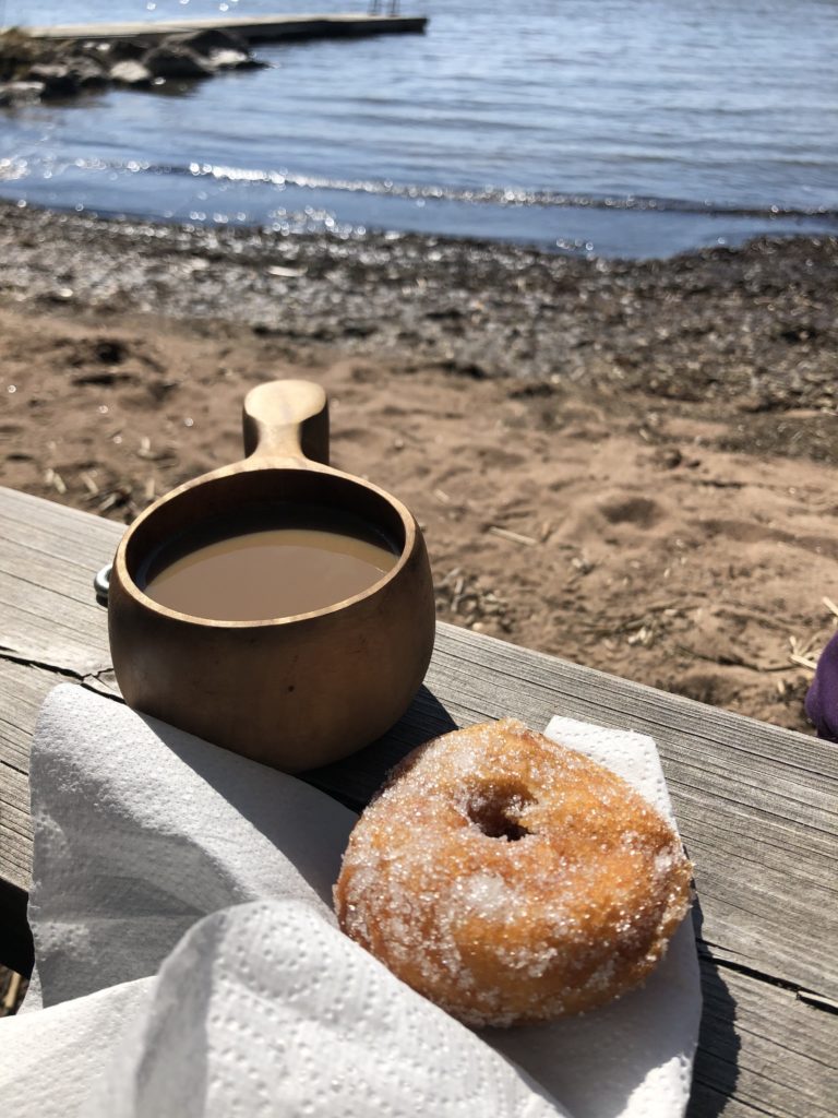 Tässä vaiheessa oli pyöräilty parikymmentä kilometriä, ja meillä oli kuutisen kilometrin matka taukopaikallemme Antinniemen uimarannalle Tammijärven rannalle. Paikka oli todella kiva, ja ne pienet hetket, kun tuuli ei osunut rannalle, oli siinä oikein mukavaa ja lämmintä levätä. Joku (Mikko) taisi olla ilmeistä päätellen tyytyväinen taukoon ja sen tuomaan lupaukseen ruoasta. Itse pääateria jäi kuvaamatta – taisi olla kiire saada se syödyksi. Jälkkäriksi oli kahvia ja tuoreet vappumunkit, ja siitä pitää saada otettua kuva. Se on jo melkein perinne.