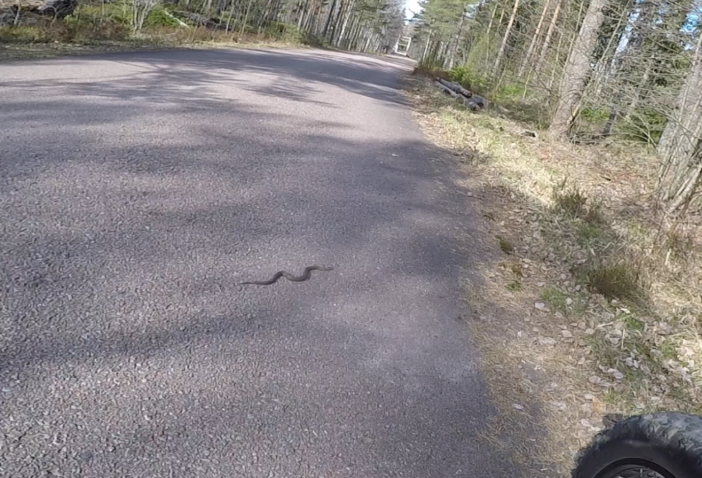 Matkan aikana ehdittiin bongata jos jonkinlaista eläintä: fasaani ylittämässä tietä, parikin haukkaa saalistamassa peltojen yllä, seitsemän joutsenen parvi ihan tien vierellä sekä kurki, joka lehahti lentoon ihan läheltämme. Tietenkin näimme myös hevosia, poneja ja koiria (kaksi pihaansa vahtivaa setteriä lähti ihan jahtaamaan meitä :D). Mutta päivän viimeinen jännittävä eläinbongaus oli pieni kyy. Piti ihan palata takaisin päin, että sain otettua luikertelijasta kuvaa.