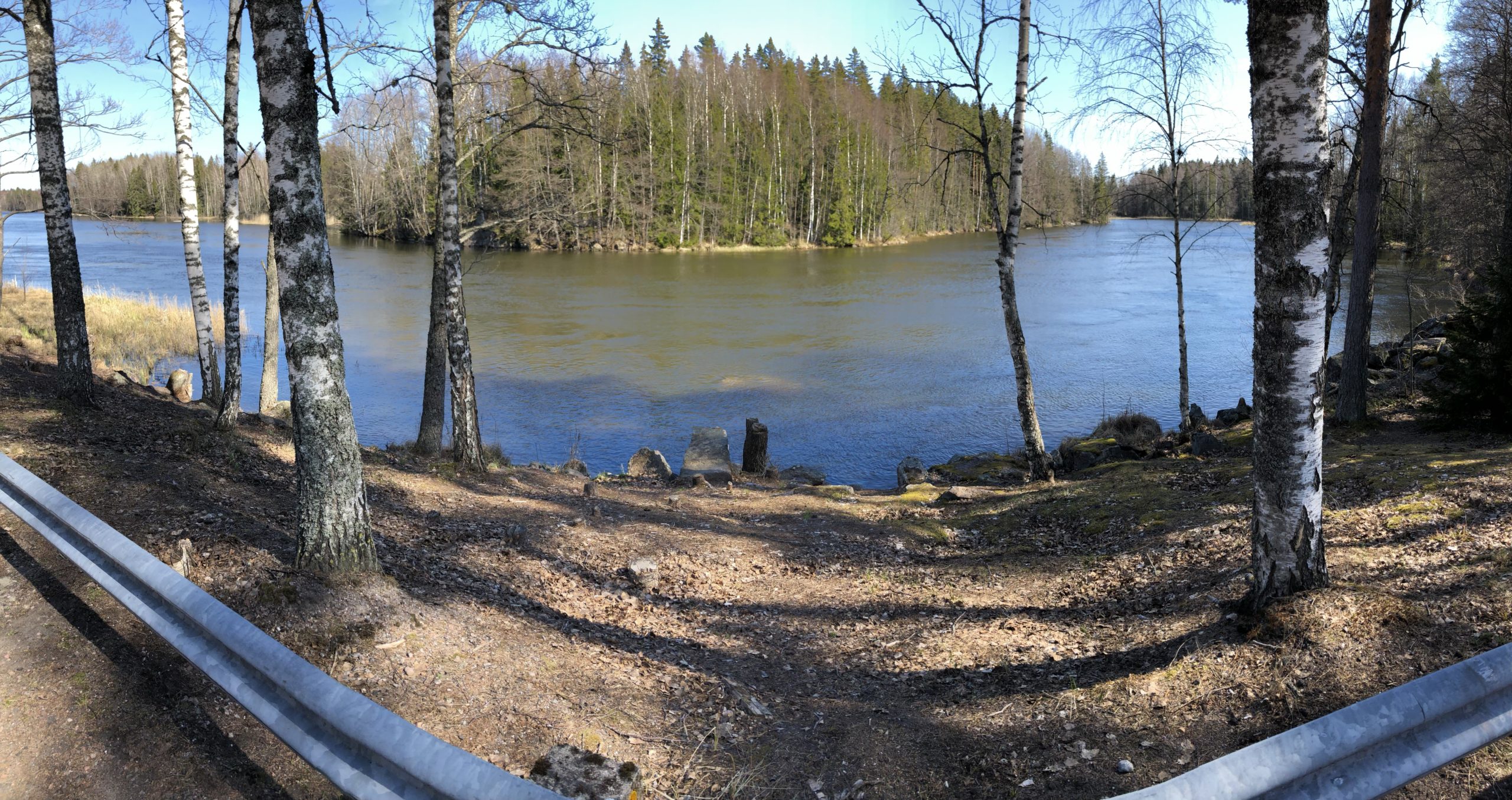 Ruotsinpyhtäälle saavuttuamme mietimme, kurvaisimmeko pitämään taukomme Strömforsin ruukilla. Totesimme kuitenkin, että jätetään se seuraavaan kertaan ja otetaan vesitauko Kymijoen rannalla sijaitsevalla taukolevennyksellä. Oikein kaunista jokimaisemaa ihasteltavaksi.