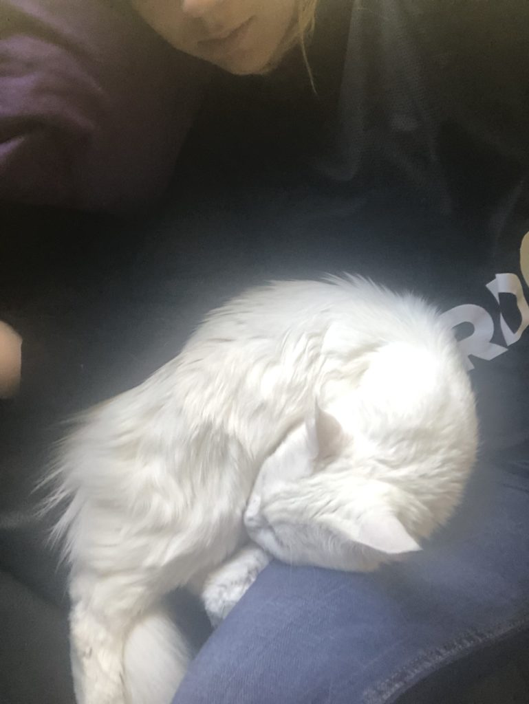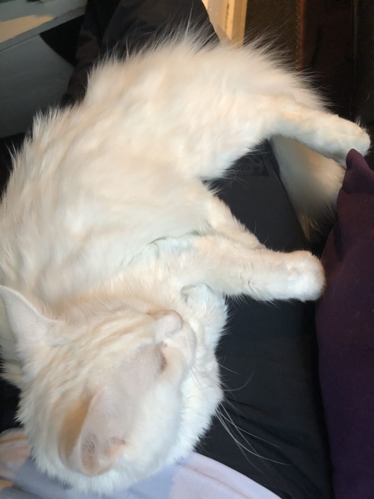 No niin, takaisin Lumiin. Tuo pieni, simpsakka valkoinen tyttö oli saapuessaan äärimmäisen ujo ja nöyrä. Siitä näki, että se haluaisi tulla viereen ja lähelle, muttei kehdannut. Se kehräsi ja puski pöytää (kyllä, pöydän pintaa) ensin metrin päässä minusta, sitten puolen metrin. Mutta ei koskaan tullut viereen tai koskettamaan. Haluaisin edelleen käyttää sanavalintaa ei kehdannut tulla, vaikka olisi halunnut. Pikku hiljaa se kehtasi ja uskalsi enemmän. Noin puoli vuotta meillä asuttuaan se uskalsi käydä sylissä – ihan huomaamatta, ohi mennen – ja noin vuoden meillä oltuaan se kierähti rullalle syliin kehräämään – ihan vain pieneksi hetkeksi.