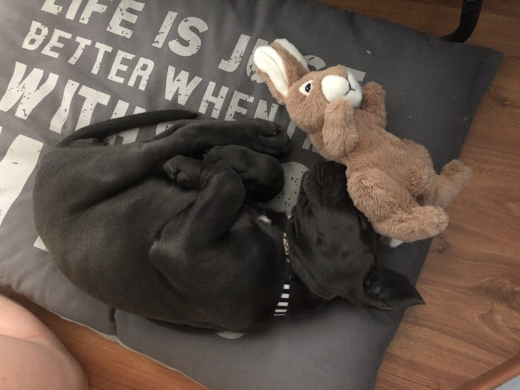 Ensimmäinen yö kotona meni mukavasti. Nukuin Venlan kanssa vierashuoneessa, joka nyt toimittaa Venlan huoneen virkaa. Pentu nukkui reilun kolmisen tuntia, jonka jälkeen se heräsi yöllä 2.30. Kävimme ulkona, minkä jälkeen Venla heräsikin syömään puruluuta – onneksi ihan rauhallisesti omalla pedillään – noin puolen tunnin ajaksi. Sitten vissiin loppui akku, kun koira sammahti uneen kuin sormia napsauttamalla, ja nukkui kuuteen asti aamulla. Minä heräsin koiran surkeaan piippaukseen, kun se oli onnistunut kiilaamaan itsensä jumiin huoneen nurkkaan, lipaston ja vierassängyn väliin jäävään rakoseen. 😀