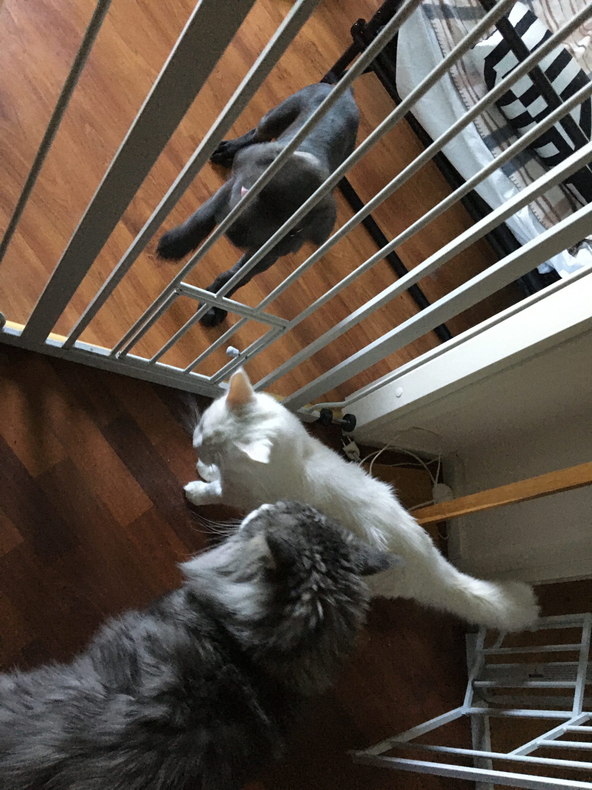 Kotona vastassa olivat Lumi ja Igor, joiden ilmeet olivat lähinnä luokkaa “…joko taas tätä?” Kissat ottivat pennun ihan mukavasti vastaan – Lumi lauman johtajana otti vaan tehtäväkseen kyykyttää pentua ja “näyttää sille paikkansa” sähinän ja (kynnettömien) tassunläymäytysten kanssa. Pieni Venla on onnistunut säikähtämään aika paljonkin Lumia, eikä nyt lähesty kissaa metriä lähemmäs. Sinänsähän tämä on ihan hyvä; pentu oppii heti, ettei kissoja saa jahdata, mutta Lumin kyttääminen menee jo kyykyttämisen puolelle ja joudun vahtimaan, ettei pentu saa oikeasti traumoja kissan sille suomasta käytöksestä.