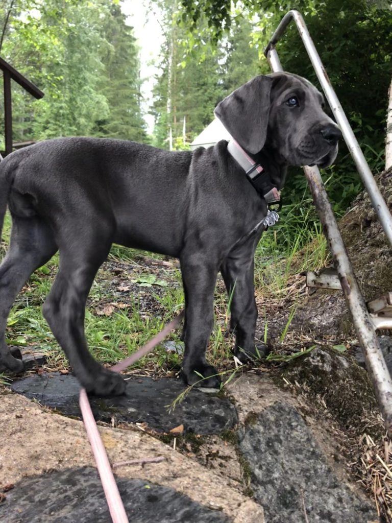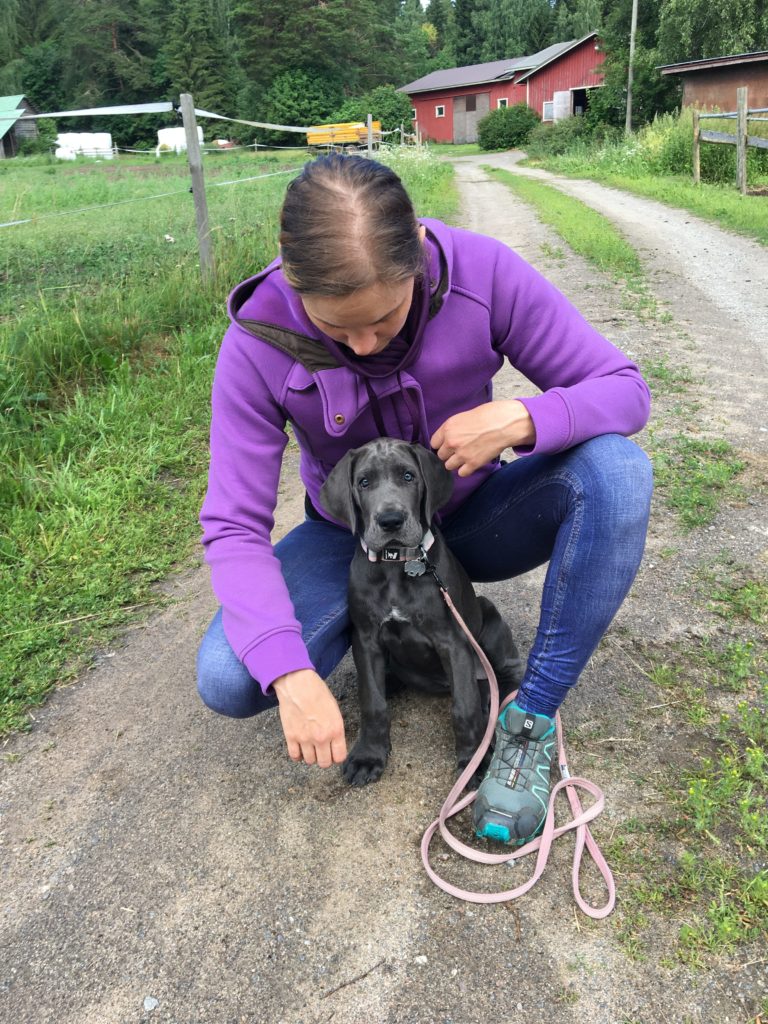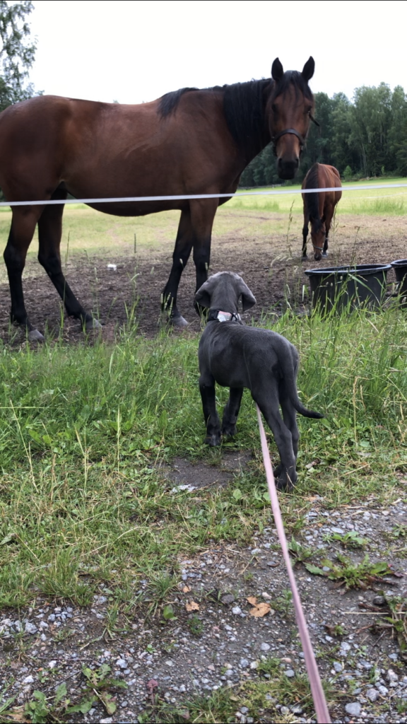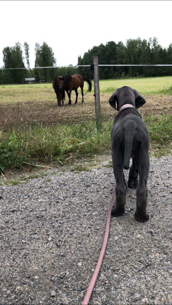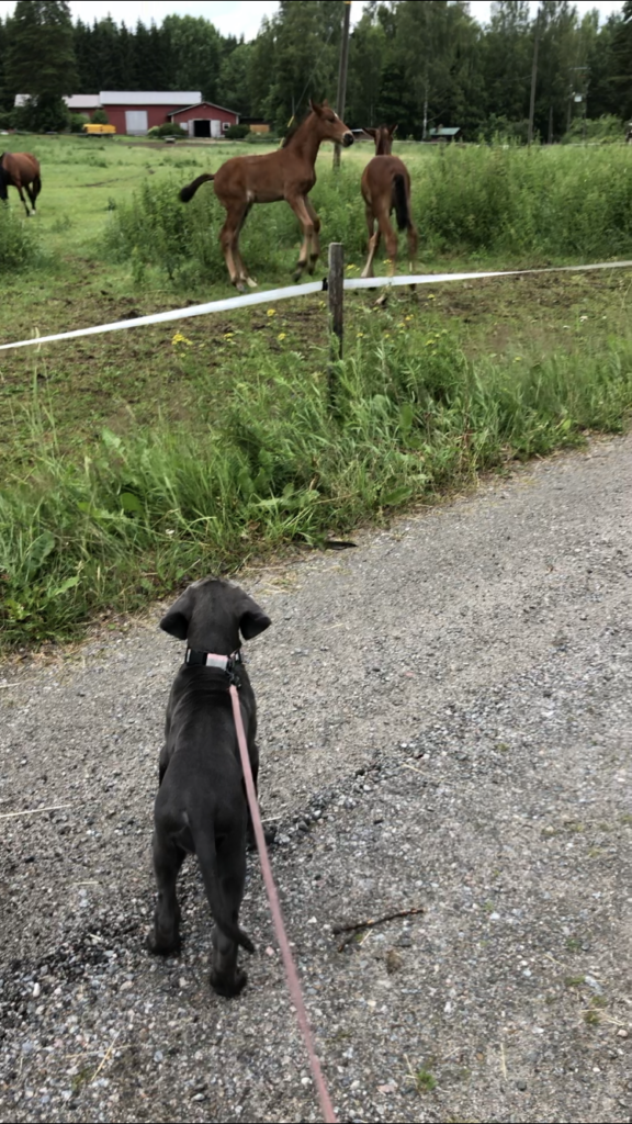 Suuntasin hevostarhojen luo ensimmäisen kerran lauantaina ehtoopuolella ihan keskenäni Venlan kanssa. Venla suhtautui hevosiin avoimesti ja reippaasti. Ihan aluksi se vähän tuumaili, että mitäs ihmettä nuo nyt sitten ovat?, mutta siitä ajatuksesta selvittyään se olisi ollut valmis lähtemään tarhaan loikkimaan yhtenä hevosista. Onneksi oli hihna välissä estämässä moiset suunnitelmat. 🙂 Eipä siinä, nämä hevoset ovat tottuneet koiriin, mutta silti.