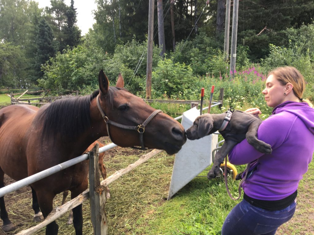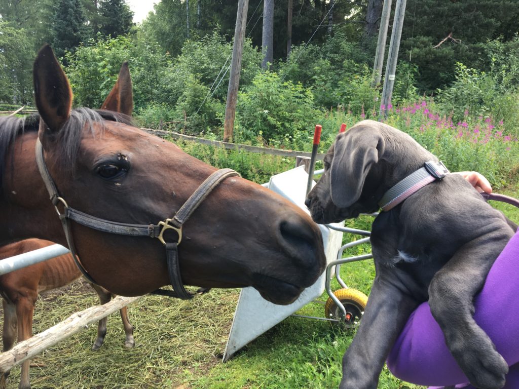 Tämän viikonlopun uutta antia oli tutustuminen naapurissa sijaitsevan tallin hevosiin. Kerrottakoon heti alkuun, että vierailuille hevosten luo (leipä- ja porkkanaterveisten kera) on saatu lupa.