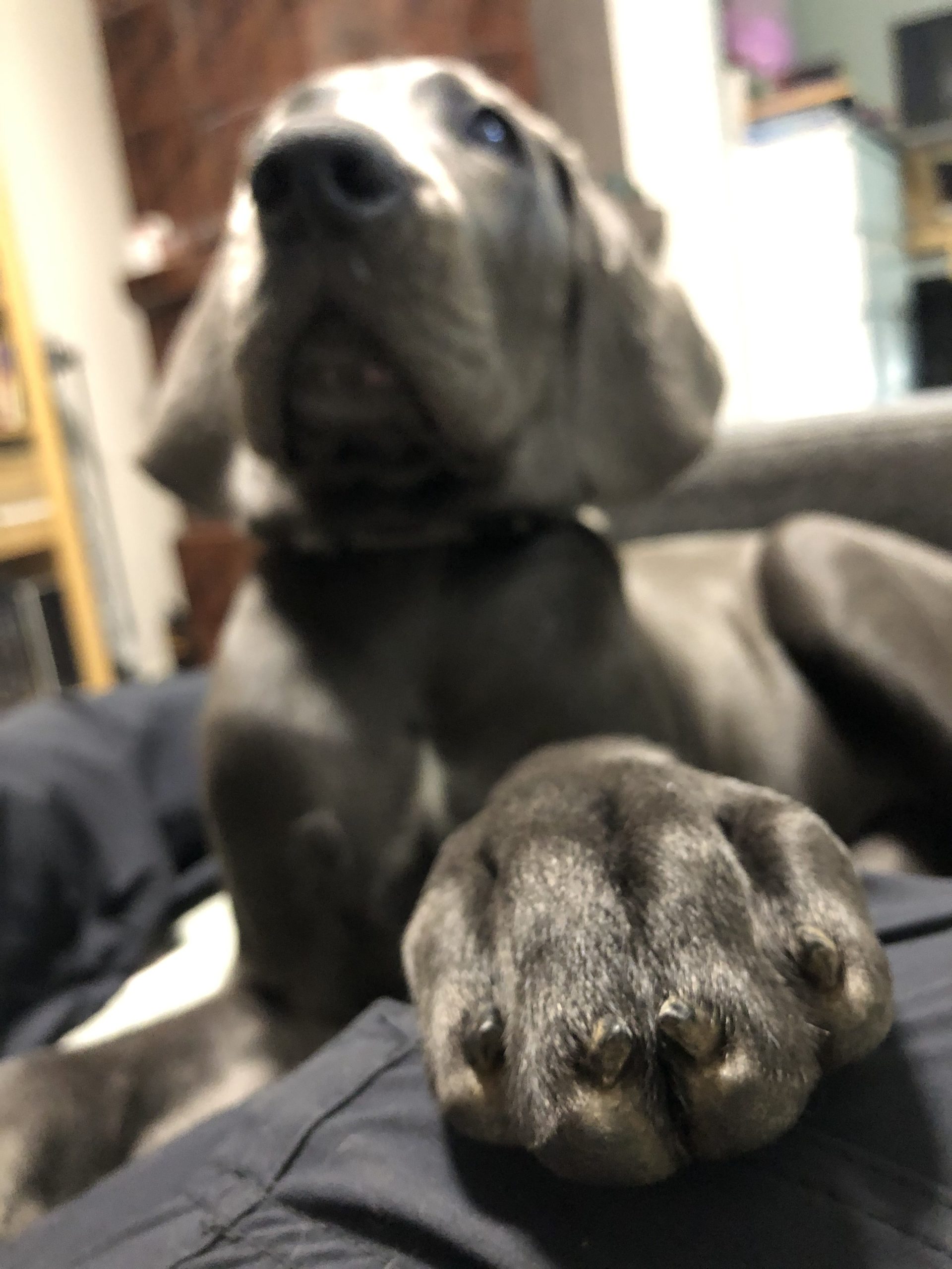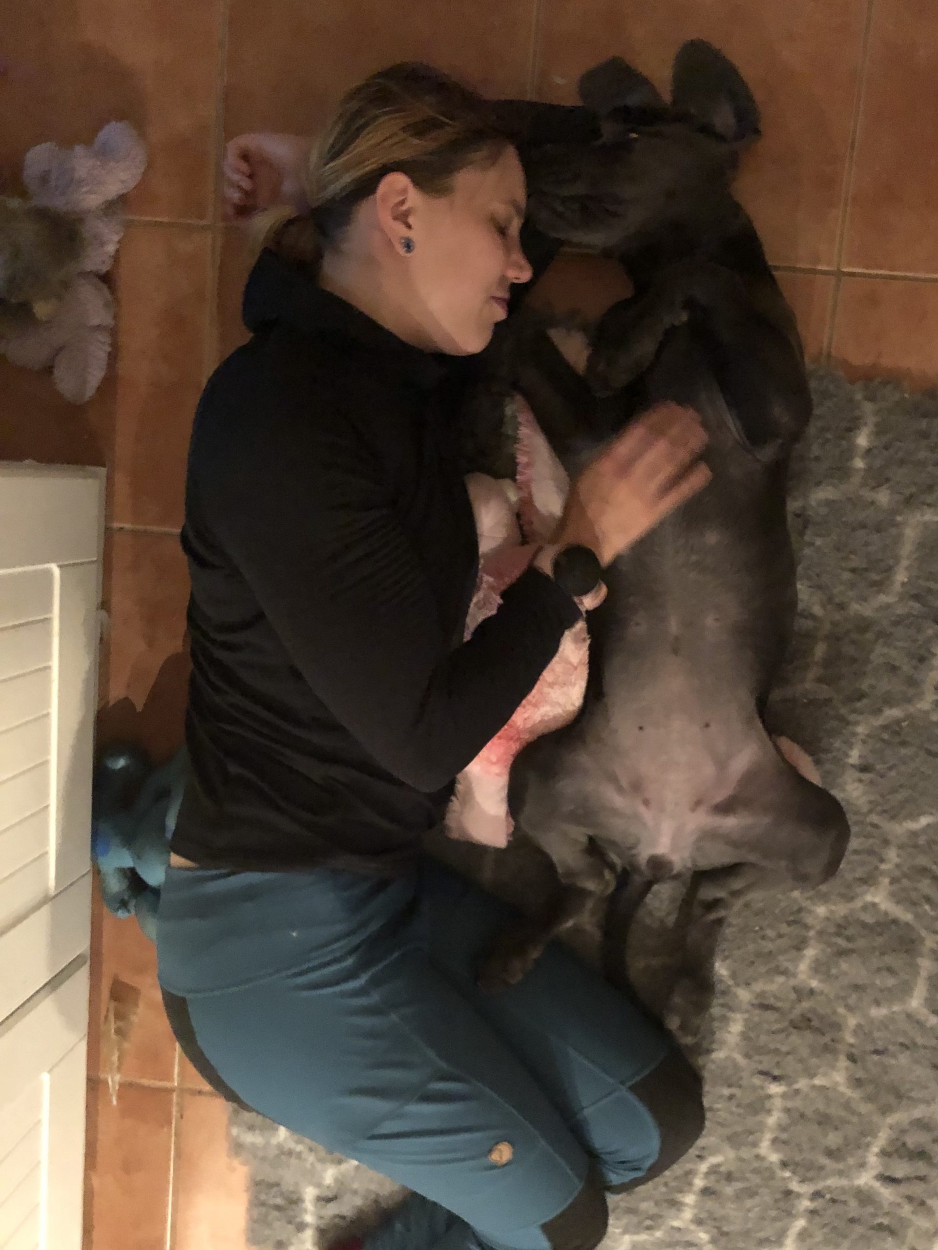 Hampsimisesta mieleeni, että yksikään aiemmista koiristani ei ole ollut näin kova puremaan eikä hyppimään. Venla hampsii käsiäni, hihansuita ja puntteja tai aamutakin naruja – ja talutushihnaa! Ah! Talutushihnan syöminen on ehkä parasta! – sadoista kielloista ja huomion siirroista huolimatta. Kiihtyessään se hyppii, ja kiipeilee ja puree hiuksia ja nenää ja korvia (yhtä lailla leikkiäkseen kuin osoittaakseen kiintymystään vähän rajulla tavalla). Naskalit luonnollisesti sattuvat aika pirusti ja on myös täysin mahdollista, että se onnistuu tikkaamaan reikiä vaatteisiini, joten ei varmaan ole mitenkään yllättävää, että koiraa joudutaan torumaan nyt aika napakasti näiden tapojen poiskitkemiseksi.