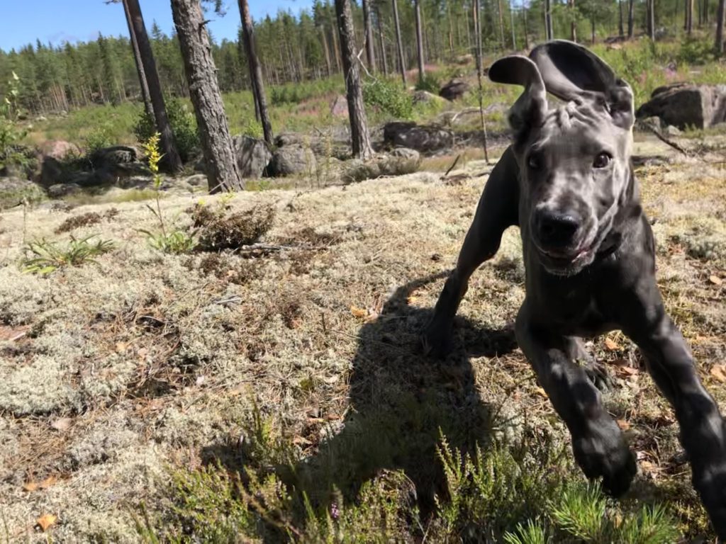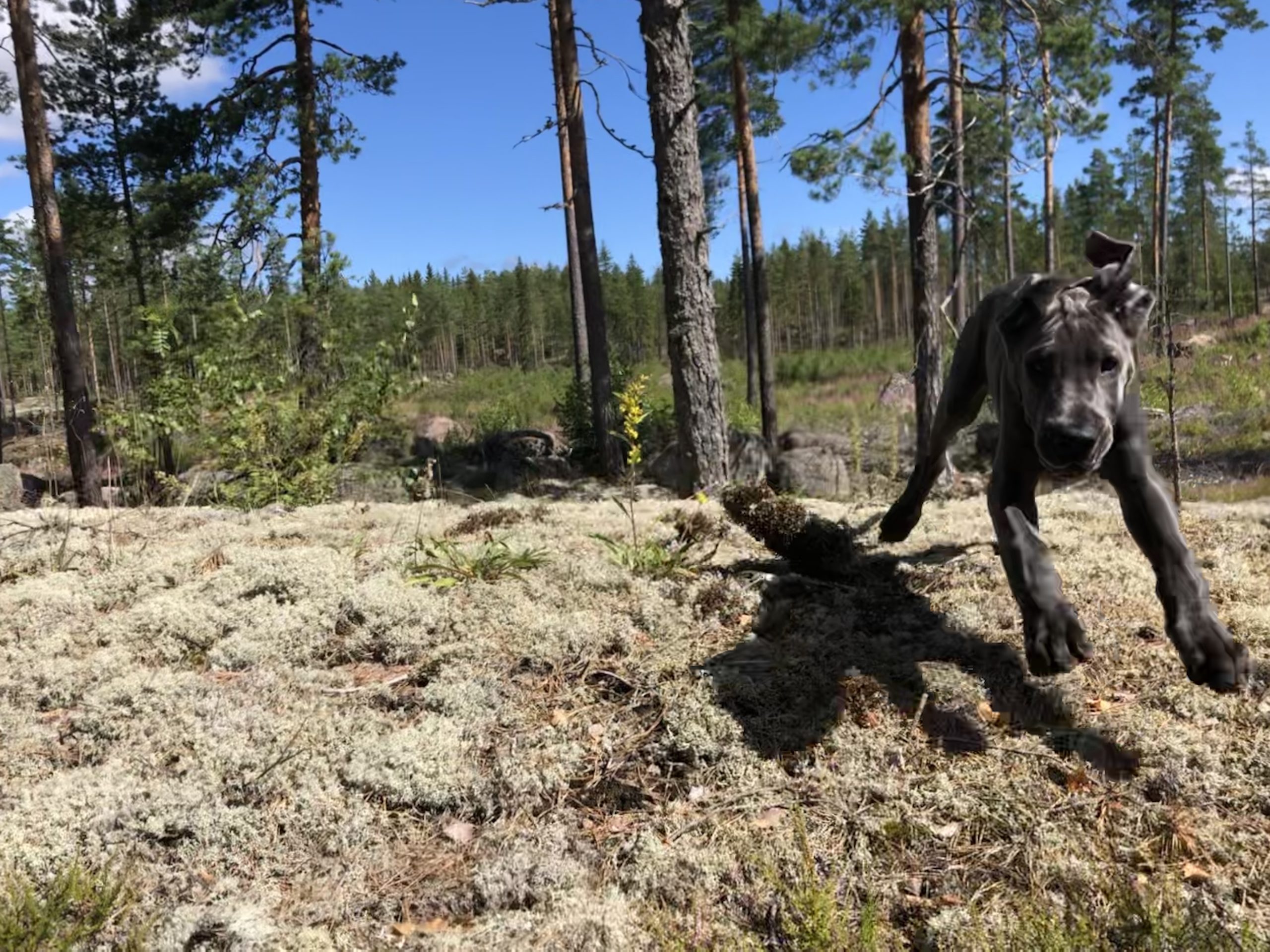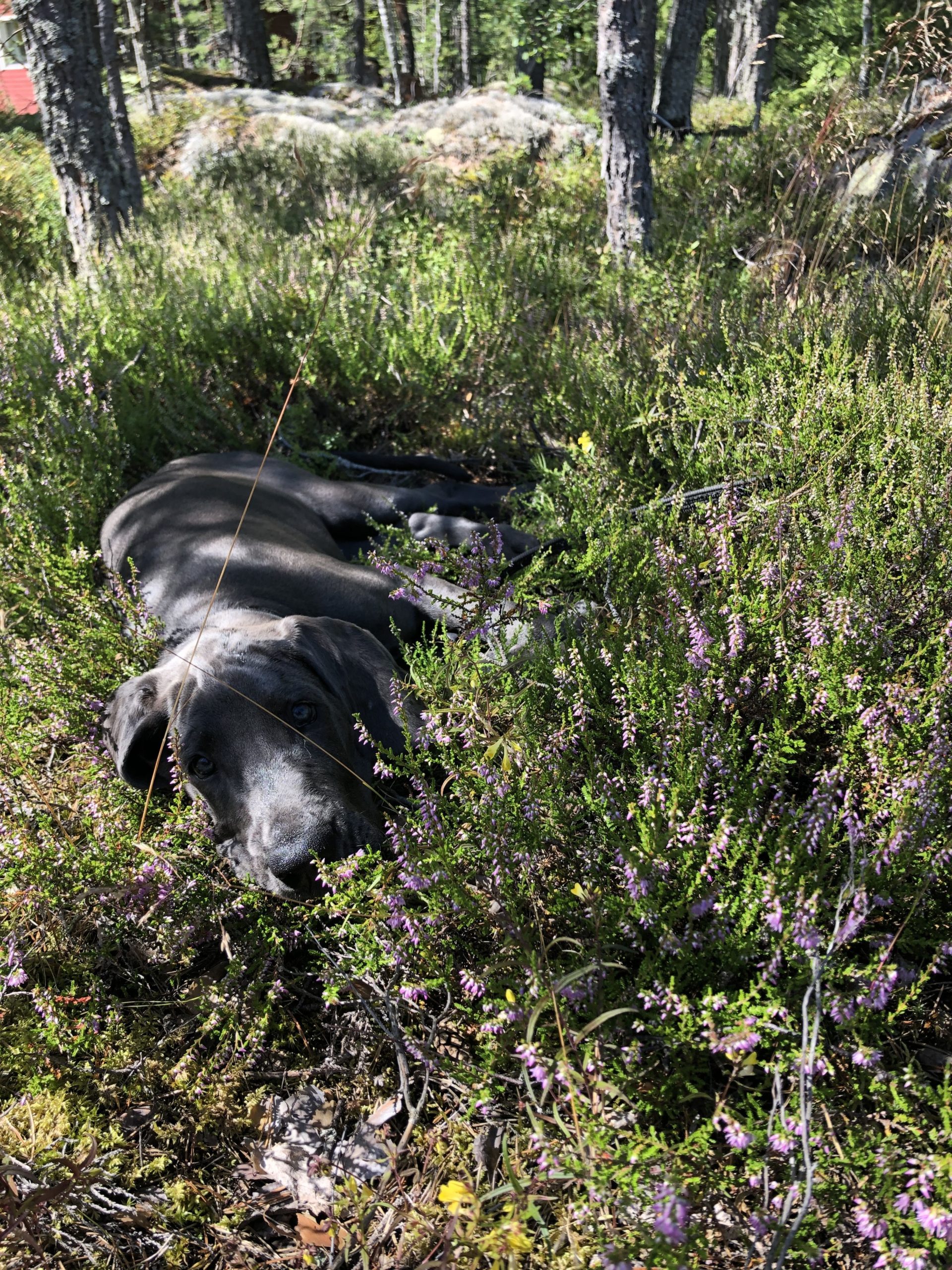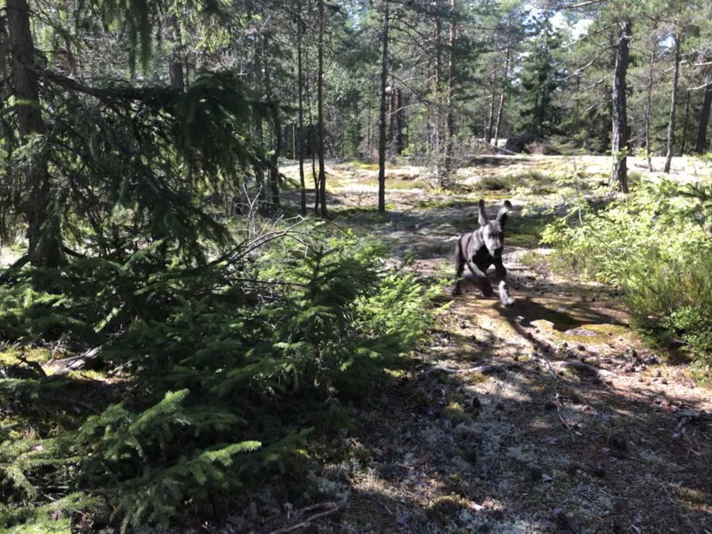Venlasta on rakentumassa ihan täys metsäläinen. 😀 Se suikkaloi hakkuuaukean oksarihmastoissa, hyppelee kiviltä toisille, kellittelee kanervikossa ja riehuu märässä sammalikossa reikä päässä. Se on myös omatoimisesti, eli opettamatta, oppinut syömään marjoja ihan itse! Mustikat uppoaa suoraan pensaista ja kypsät vadelmat se hotkaisee suoraan pensaasta. Mä joudun nimittäin pitämään puoleni, että ennätän saada itselleni riittävästi :O 😀