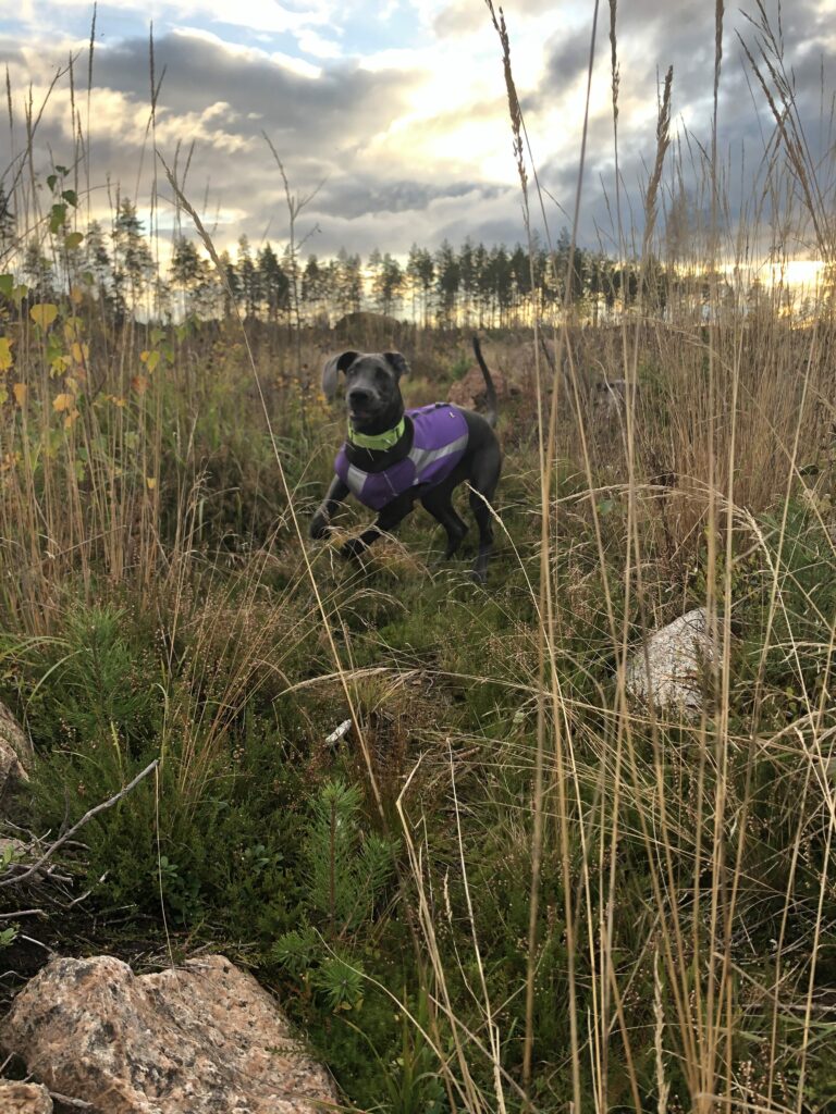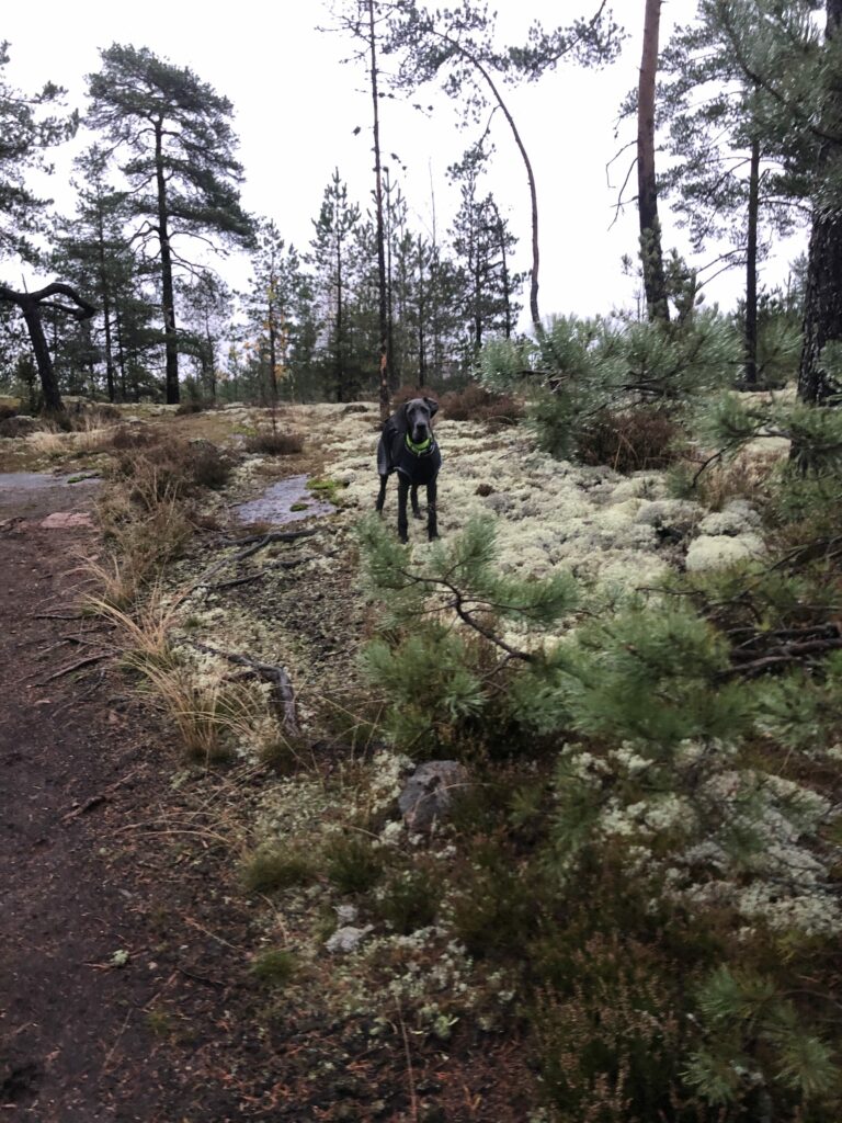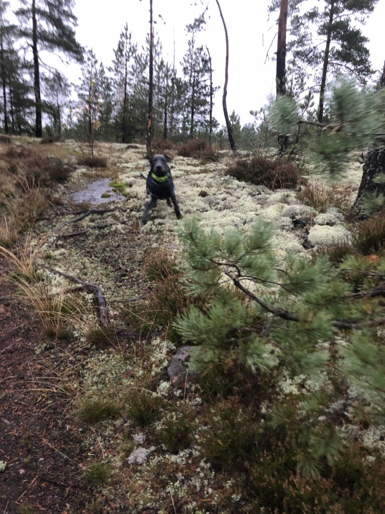 …Ja lisäksi Äitin kotiintulo tarkoittaa, että aktiivinen aika päivästä voi alkaa, ja Venla pääsee Touhuamaan Kaikkea Jännää Äitin kanssa. Välillä käydään näyttelytreeneissä, välillä meillä käy vieraita ja aina joskus käydään jossain kylillä, kuten Eläinkaupassa. Mutta yleensä lähdetään Metsälenkille! Metsälenkillä voi esimerkiksi Vaania Äitiä, ja jos lenkille osuu Se Kiva Sammalkosteikko, niin siellä on ihana juosta ja hörppiä vettä ja rallattaa menemään vauhdikkaasti. Muuten lenkillä tulee Juostua, Kiipeiltyä, Kannettua Keppejä (ja tietenkin Vaanittua pahaa-aavistamatonta Äitiä), Syödä Mustikoita suoraan pensaasta (NAM!) ja Kannettua Käpyjä.