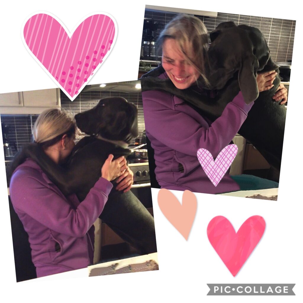 Sitten. Vihdoin, VIHDOIN Äiti palaa töistä!! Siitä on ainakin miljaaaardi vuotta, kun Äiti aamulla lähti ja hylkäsi pienen koiranpennun! Tilanne vaatii ISOJA pusuja ja haleja!! Koska Äiti on Ehkä Maailman Paras Asia!!