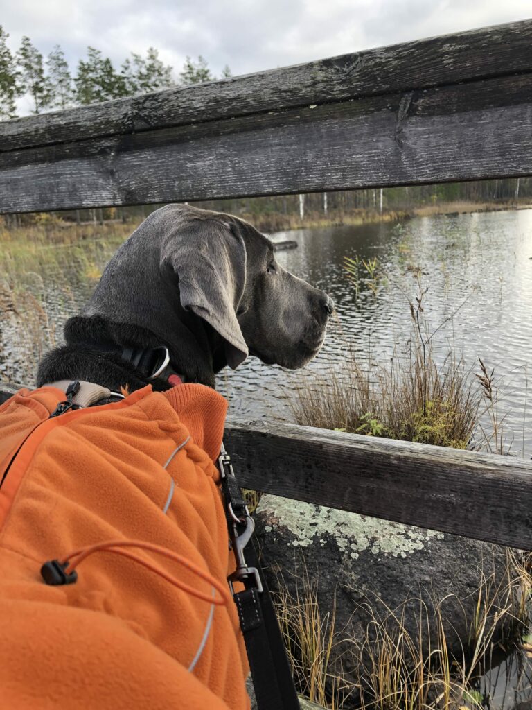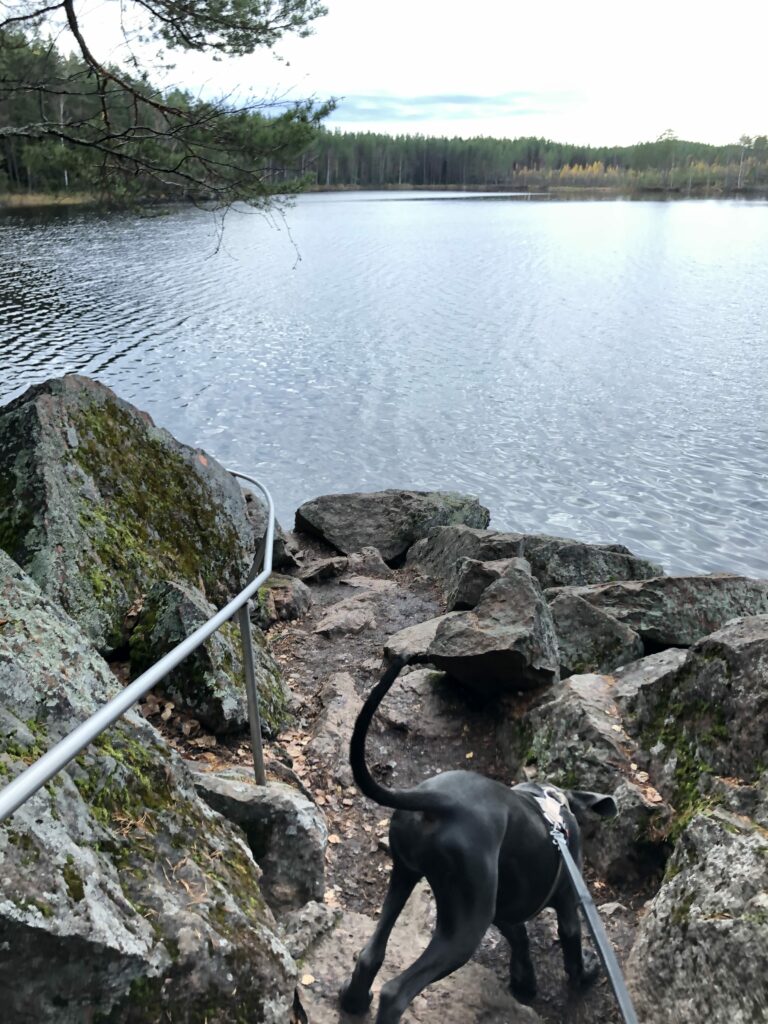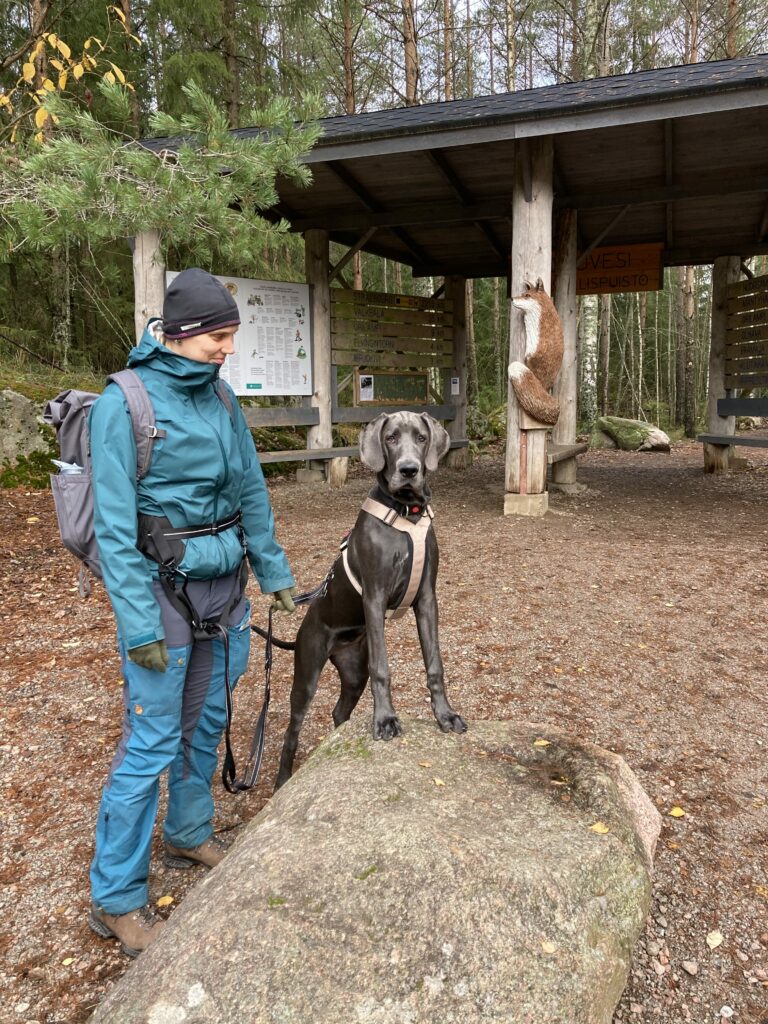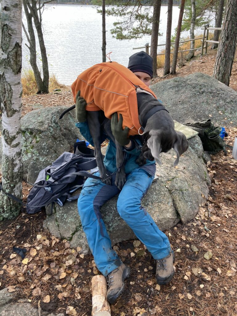 Venlan kanssa oli kyllä todella kiva kulkea tuolla maastossa. Siitähän on siis tulossa aivan upea retkikaveri. Venla on täynnä intoa ja tarmoa ja uteliaisuutta ja rohkeutta tehdä ihan mitä vaan ja hypätä mukaan ihan mihin vaan. Sille ei tule olemaan este kiivetä haastavia maastoja, kuten kivikoita, siltoja, rappusia tai vesiesteitä. Jospa sille olisi jäänyt jotain mieleen myös tämänkertaisen taukopaikan loistavasta rauhoittumisesta ja lepäämistuokiosta.
