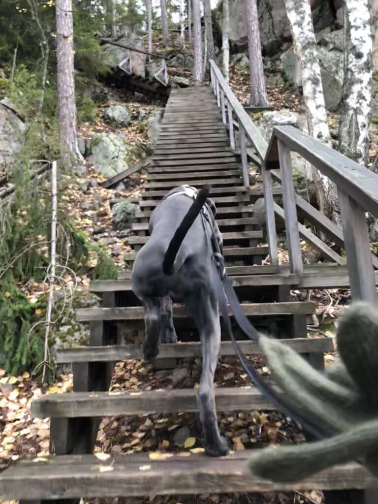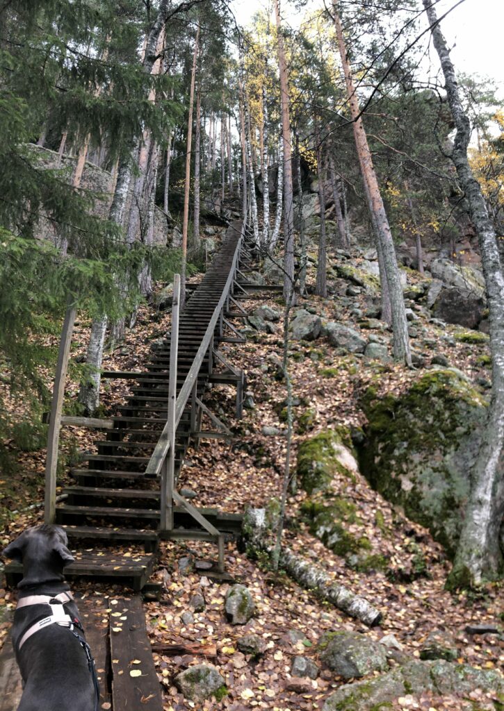 Emme laskeneet portaiden määrää, sillä Venla painatti menemään portaita kuin mikäkin vanha tekijä ja punnersi niitä parhaillaan kaksi askelmaa kerrallaan. Minä yritin pysyä vauhdissa ja kehuin samalla reipasta pentua… ei tullut laskettua askelmia tällä kertaa. Mutta niitä oli monta.