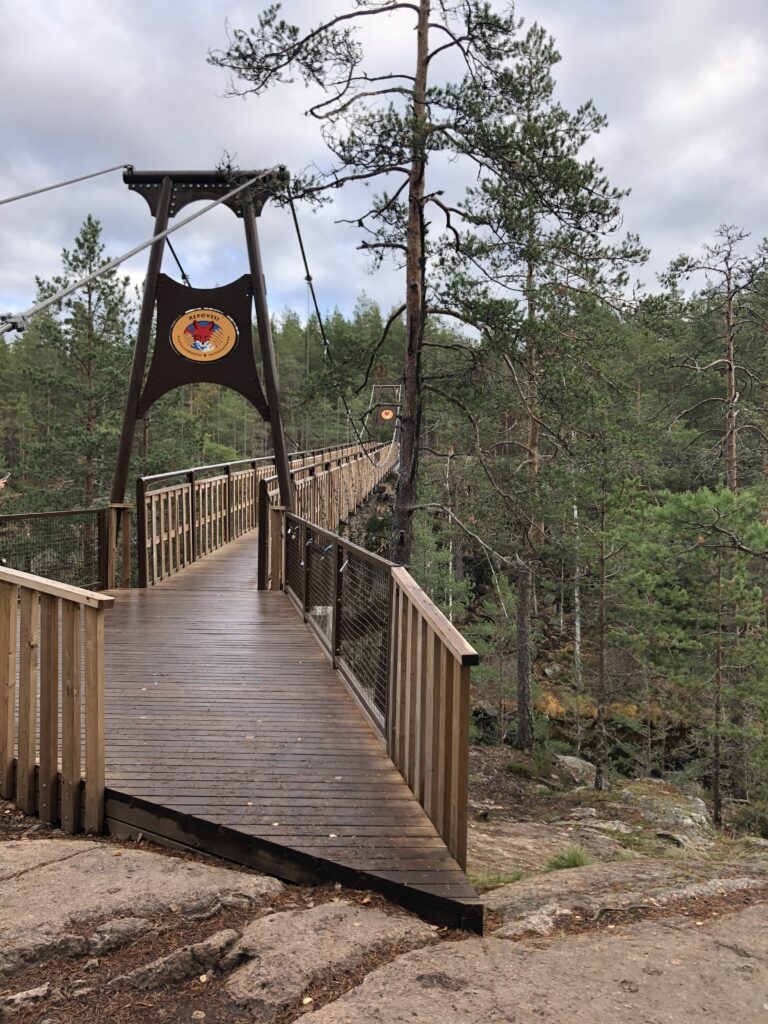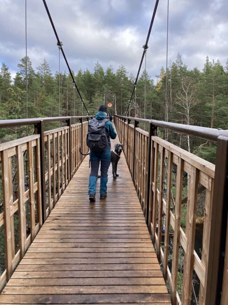 Venlalle tämä oli tietenkin nyt ensimmäinen käynti Repovedellä, ja itse asiassa mekin päästiin testaamaan ekaa kertaa uusittu riippusilta – tai oikeammalta nimeltään se näyttäisi nyt olevan pylonisilta. Täytyy sanoa että jämeryydestään huolimatta silta oli onneksi edelleen hyvin ‘riippusiltamainen’, me kun molemmat pelättiin että Kapiaveden ylittäisi nyt betoninen mörskä. Mutta kyllä se silti jopa huojui (vähän) askelten alla 🙂 Venlaa silta ei jännittänyt yhtään, reippain askelin se täpsytti menemään sillan yli.