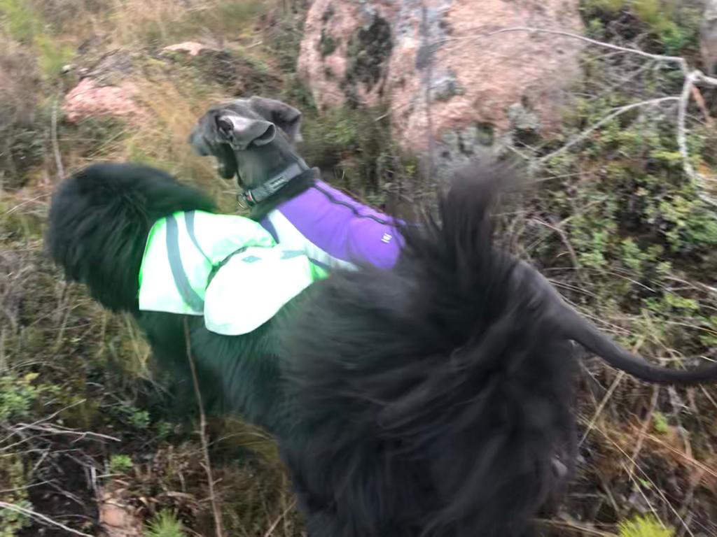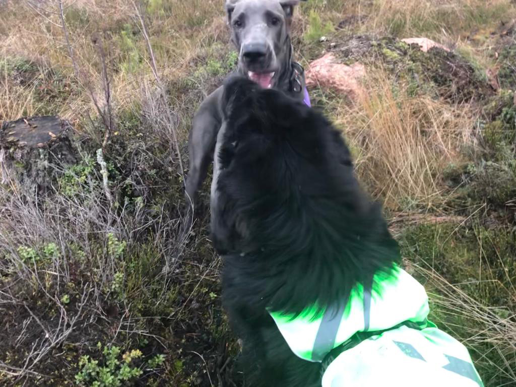Olen nyt tehnyt ryhtiliikkeen ja ruvennut ahdistelemaan ihmisiä sillä hieman laajemmalla mittaussäteellä, että josko saataisiin leikkitreffejä sovittua. Ensimmäinen pelastava enkeli ilmestyi hyvin karvaisessa ja mustassa muodossa, kun Waldo pääsi lähtemään metsälenkille kanssamme!
