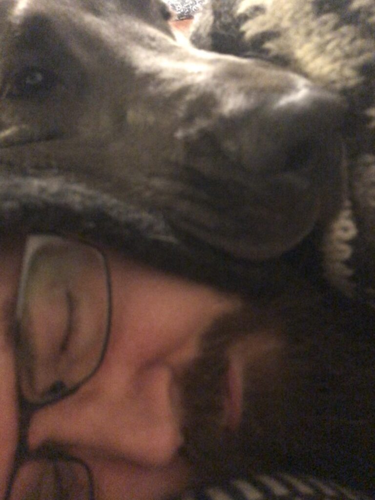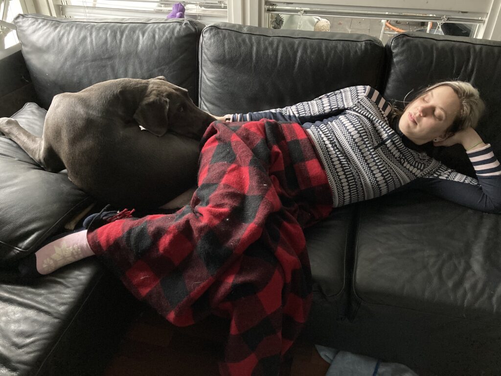 Sen sijaan tauko Moronvuoren päivätuvalla, joka evästyksineen venähti jokseenkin pitkäksi, oli minullekin vähän raskasta. Minulla oli mukana Venlalle kaksi puruluuta, yksi matkalta poimittu Ihana Oksa sekä kilo koulutusnameja. Vee ei vaan malta rauhoittua viittä minuuttia pitemmäksi aikaa, ennen kuin uusi ärsyke, kuten ohi sujahtava lapsonen, taikka sitten ihan vaan paikallaan pötköttävä käpy, muuttuu kiinnostavammaksi. Oma taukoni oli siis enemmänkin koiran viihdyttämistä – tai oikeammin sen pitämistä poissa pahanteosta, kuten kaivamasta (kansallispuiston!) maata, syömästä omaa hihnaansa poikki, ratsaamasta naapureiden eväitä (ehti tehdä senkin, kaivoin kidasta kimpaleen voita…) tai hyppimästä ohi yrittävien ihmisten päälle.