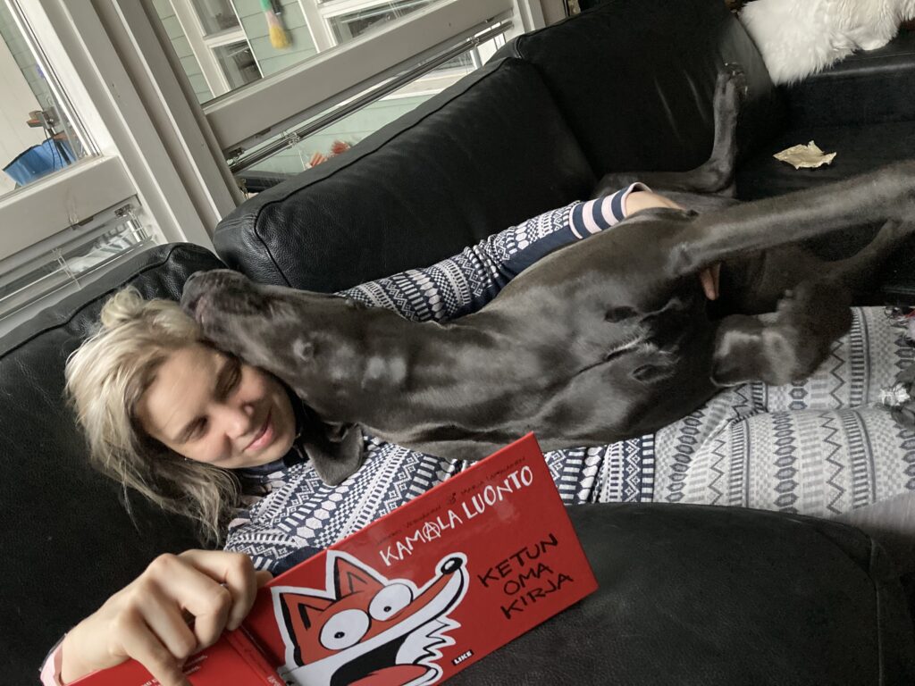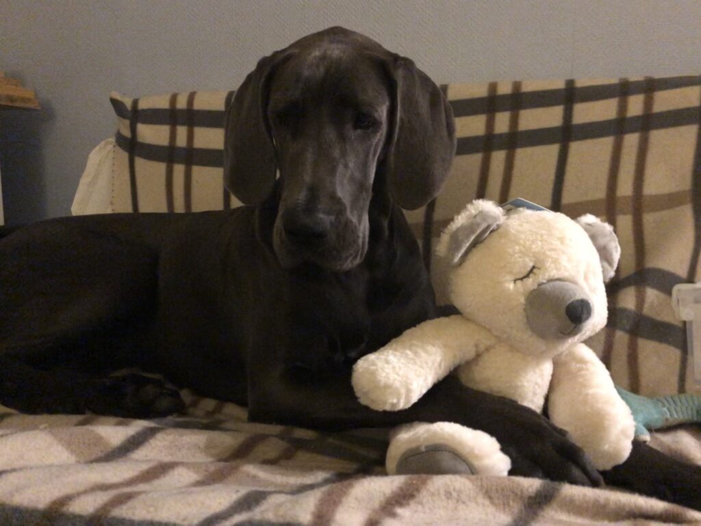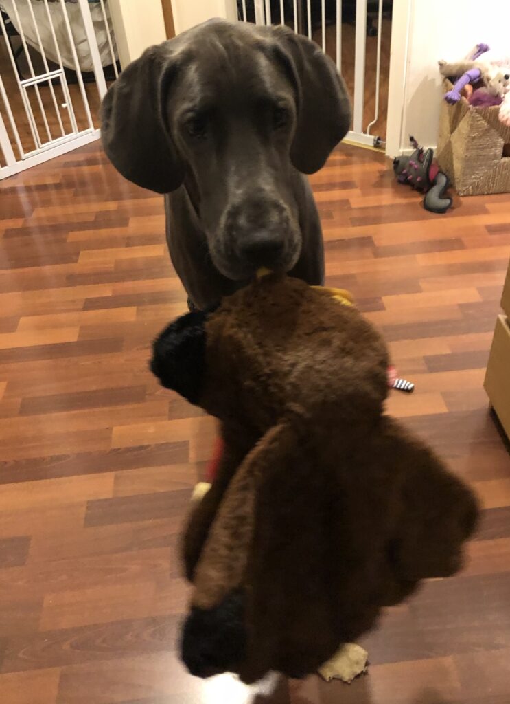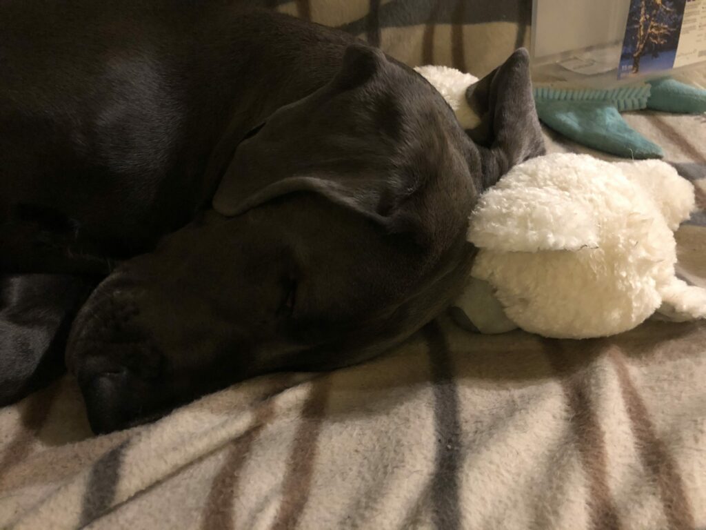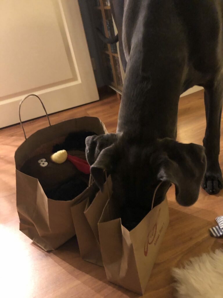 Venla sai tietenkin herkkuja, eli erilaisia puruluita ja Bottom Sniffer –nimistä ’koirien olutta’ sekä leluja: nallen, pingviinin, virtahevon ja kalkkunan. Yhtä suosikkia ei löytynyt, vaan kaikkia näitä leluja kuljetetaan, kannetaan, natustetaan ja vingutetaan vuorotellen!