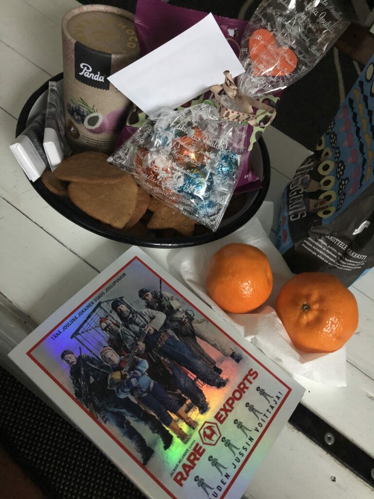 Jouluaattoaamu alkoi puurolla (itse asiassa joo-o, Venlankin nappula-ateria sisälsi puurojauhelihaa). Minun ja Mikon joulupuuroiluun tuli mukaan jännittävä käänne, kun sain idean, että puurostaan mantelin löytänyt saa avata heti aamusta yhden lahjapaketin! Nanosekunnissa molemmat ryntäsivät lappaamaan vielä yhtä kauhallista puuroa lautaselleen. Jännitys tiivistyi puuron huvetessa kupeista, mutta ei – mantelia ei tullut vastaan. Se olisi siis vielä puurokattilassa. Tein jatkosääntöehdotuksen, jossa kumpikin jättäisi yhden paketin avaamatta huomisaamun puuroannoksia varten. Mantelin löytäjä saisi avata lahjansa, ja toinen sitten taas… ei. 😀 Ehdotus ei jostain syystä mennyt läpi, joten tuli santsikierroksen paikka. Tilanteen vakavuudesta kertoo se, että uusintakierrosta ottaessa jouduin tekemään valheenpaljastustestin, ja lisäksi jouduin näyttämään hihani, ettei niihin ole piilotettu manteleita. ;D Manteli osui kuitenkin minun kohdalleni (ei, en huijannut!) ja sain avata yhden paketin heti aamulla! Olin kuitenkin sen verran joulumielellä, että toin Mikolle kanssa pienen herkkuja sisältävän joulupussukan lohtupalkinnoksi. Näin kaikilla oli mahat täynnä ja hyvä mieli 🙂
