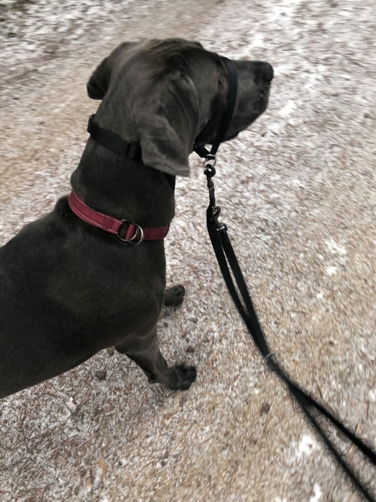 Tähän minun vastaukseni on kuonopanta. Kuonopannan kanssa koira kyllä edelleen saa (valitettavasti) loikittua, mutta pystyn silti hallitsemaan ja hillitsemään tätä 45-kiloista ylienergiaa eikä se pääse vetämään kuten pelkällä pannalla tai valjailla pystyisi. Tästä syystä kävely tuntui minun mielestäni huomattavasti mukavammalta kuin mitä pelkäsin sen olevan.