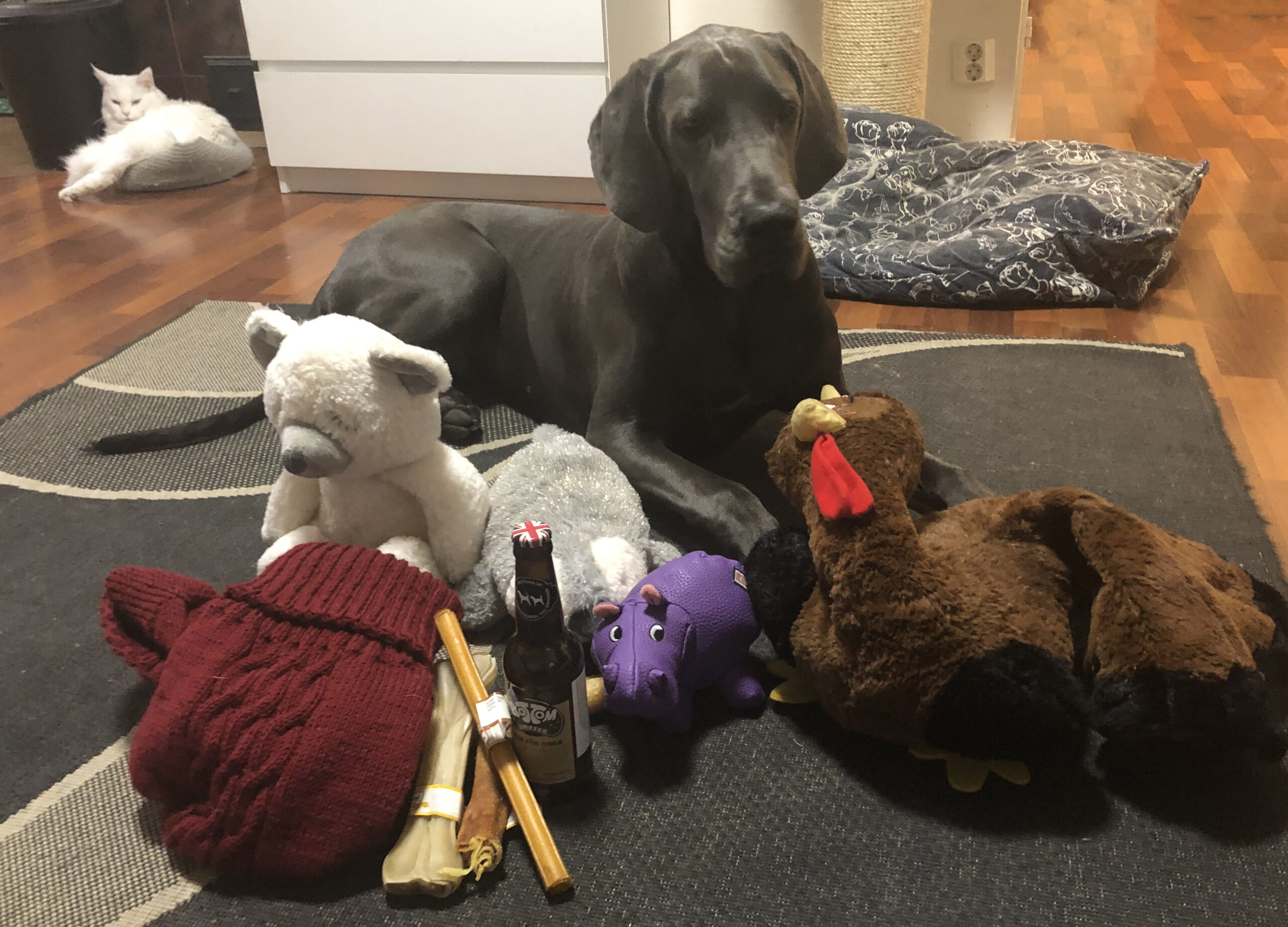 Venla sai tietenkin herkkuja, eli erilaisia puruluita ja Bottom Sniffer –nimistä ’koirien olutta’ sekä leluja: nallen, pingviinin, virtahevon ja kalkkunan. Yhtä suosikkia ei löytynyt, vaan kaikkia näitä leluja kuljetetaan, kannetaan, natustetaan ja vingutetaan vuorotellen!