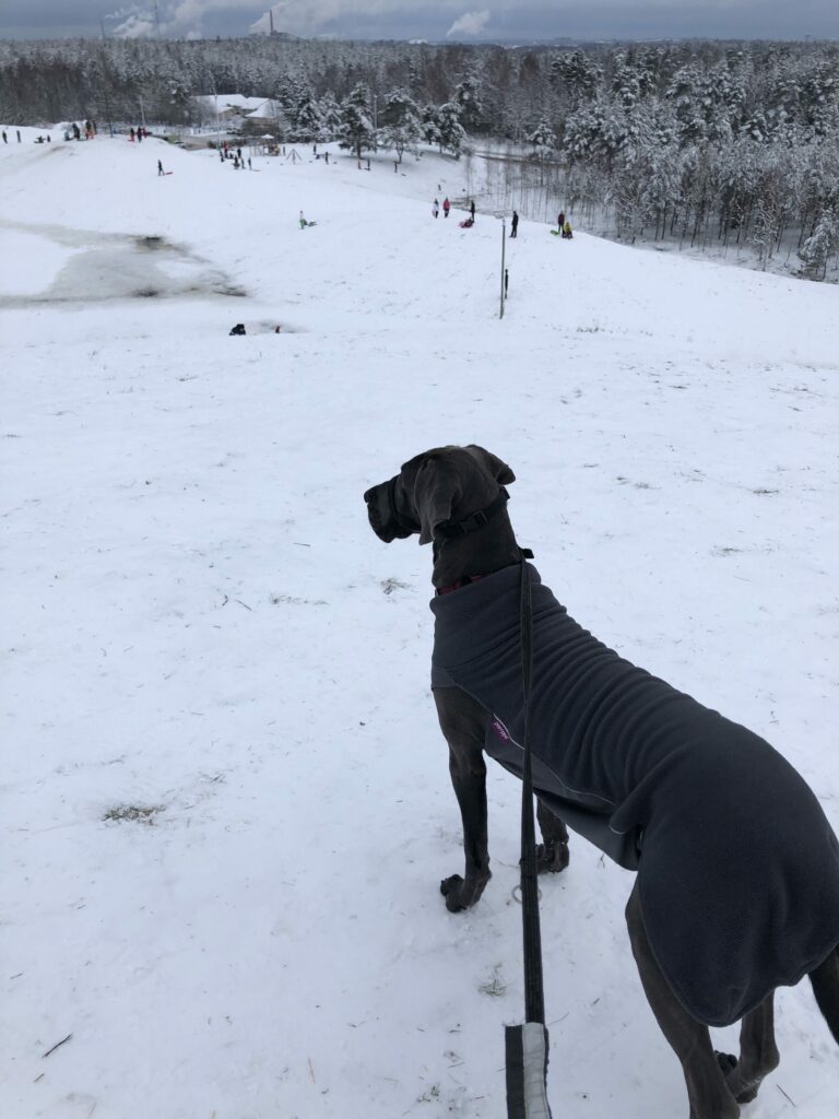 Kaikkien kiljuvien pulkkien ja stigojen sekä rauhallisesti käyttäytyvien ihmislasten ihmettely oli sen verran jännää, että loppupäivä vietettiin ihan rauhallisissa tunnelmissa kotona. Kyllä se “kylillä pyörähtäminen” aina välillä kannattaa, tekee ihan hyvää pienen koiralapsen päänupille!