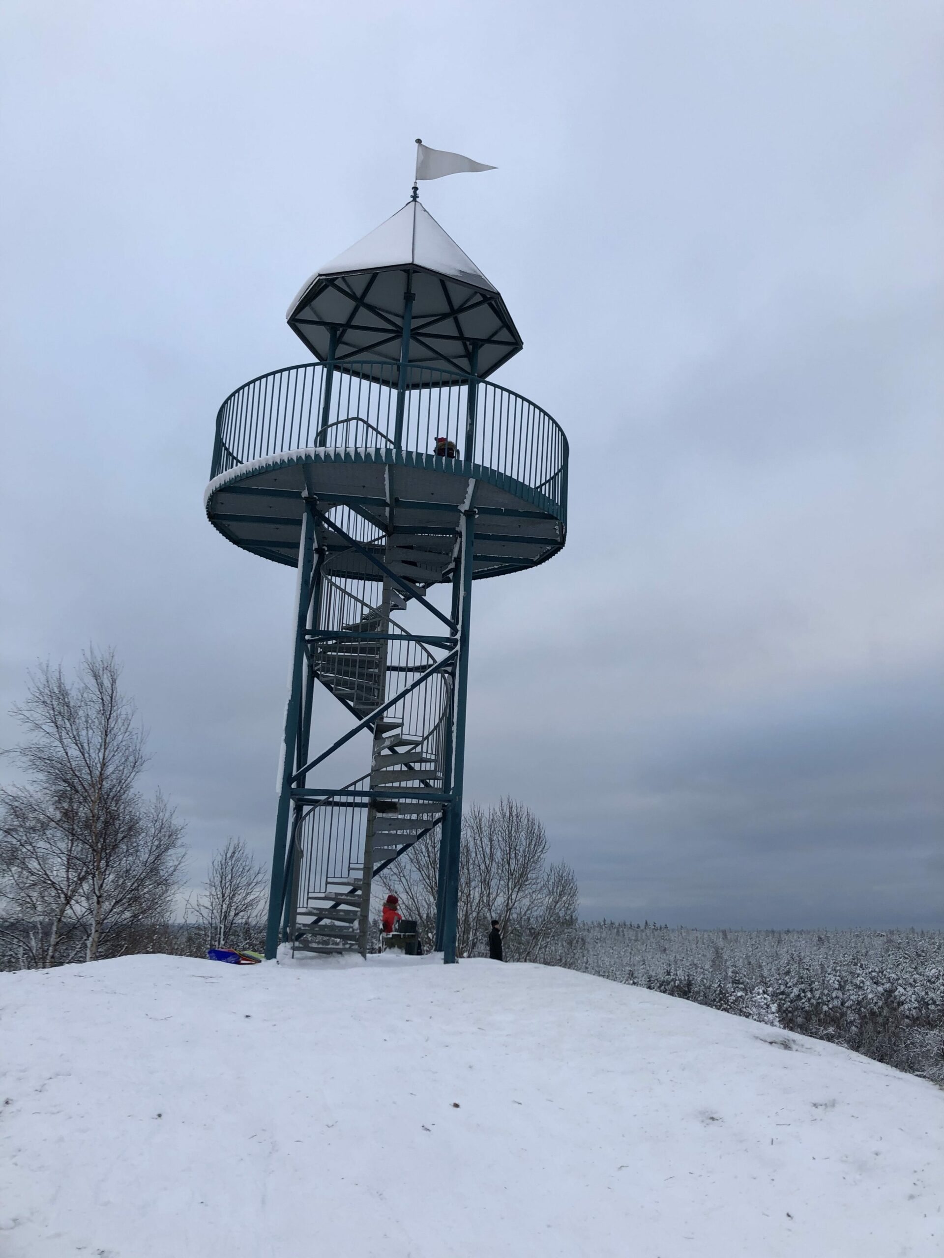 Kumparepuiston korkeimmalla mäellä on näköalatorni, jonne johtaa ritiläverkkoiset kierreportaat. Torni on itsessään niin korkea, etten edes ajatellut kiivettäväni Venlaa sinne ylös asti. Mutta, halusin saada sen onnistuneesti kiipeämään ritiläportaille, edes pari askelmaa, ja tulemaan sitten ne alas. Noin niin kuin harjoituksen kannalta. Eka askel on aina tunnetusti se isoin harppaus, mutta sen jälkeen alkaa sujua kuin leikkiä vaan. Muutaman portaan me kapusimme ylöspäin, sitten onnistuneesti käännyttiin keskellä portaikkoa alaspäin ja tultiin ne samat muutamat portaat vielä alaspäinkin. Ja toki onnistunutta suoritusta vahvistettiin toisella samanmoisella suorituksella. Näppärä Venla! Tiedän, että seuraavalla kerralla tällaisten läpinäkyvien ritiläportaiden kulkeminen tulee olemaan helpompaa – ja sellaisia saattaa reissuillamme tullakin ihan hyvin vastaan… 😉