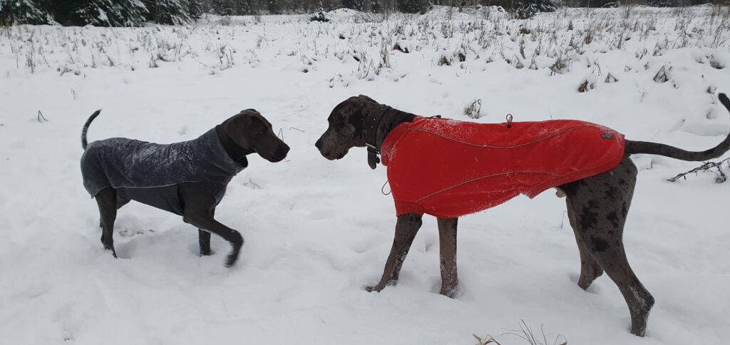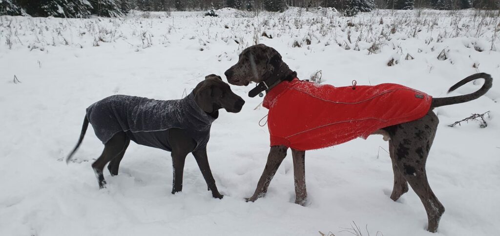 Onneksi Venlalla oli päällä Pompan fleece, joka vielä venyi Pepen päälle. Niinpä Pepen punainen ja läpimärkä takki riisuttiin pois ja pojan ylle puettiin Venlan kuiva fleece. Sitten koirat pidettiinkin koko ajan liikkeessä ja palasimme suorinta reittiä autoille. Onnenkantamoisena Kristalla oli autossa Pepen toppatakki, joten Venlan fleece vaihtui kuivaan toppatakkiin. Pepen selkä oli muuten aivan lämmin ja kuivanpuoleinen, sillä Venlan fleece oli imenyt kiitettävästi kosteutta pois koiran turkista.