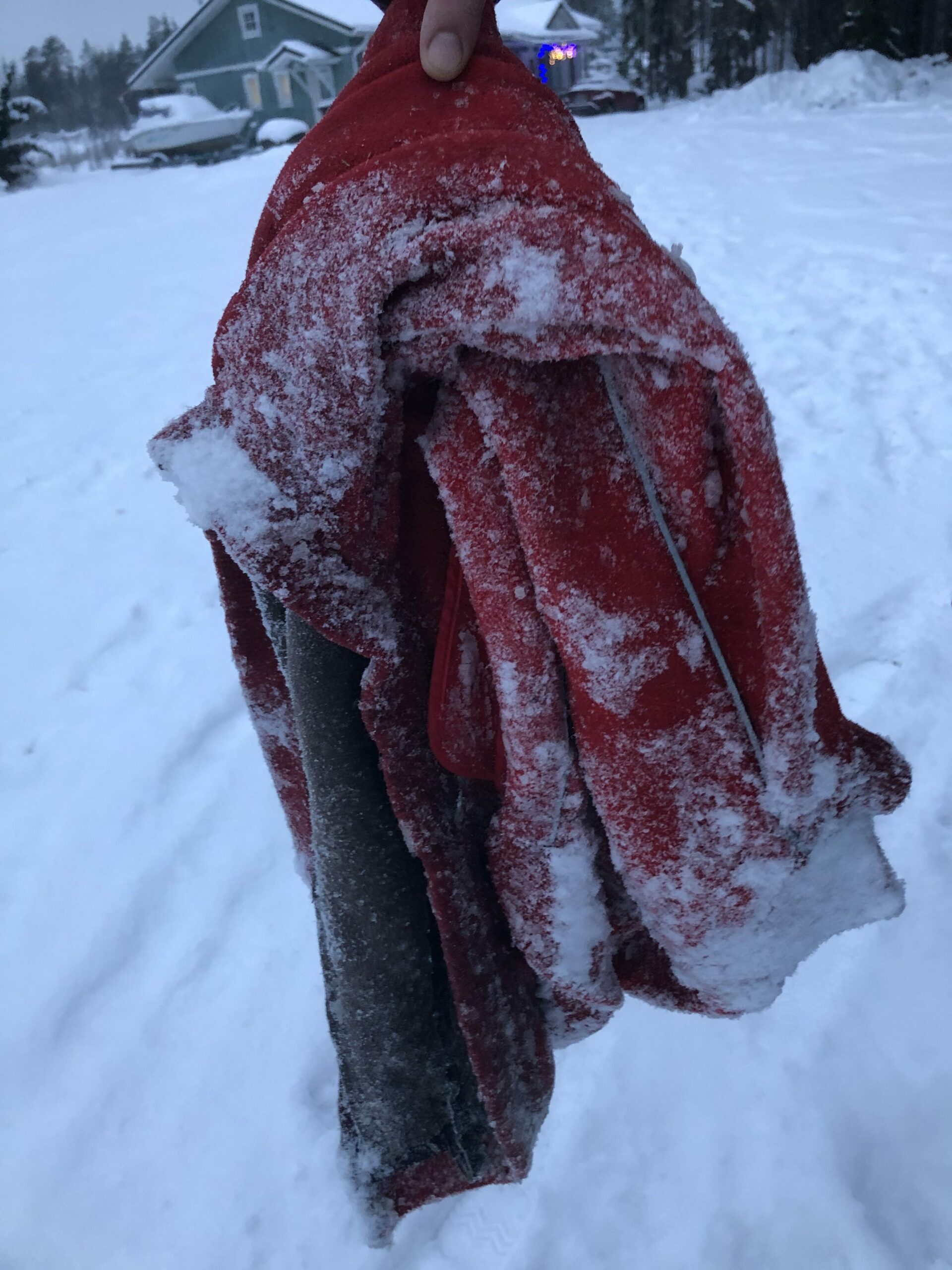 Onneksi Venlalla oli päällä Pompan fleece, joka vielä venyi Pepen päälle. Niinpä Pepen punainen ja läpimärkä takki riisuttiin pois ja pojan ylle puettiin Venlan kuiva fleece. Sitten koirat pidettiinkin koko ajan liikkeessä ja palasimme suorinta reittiä autoille. Onnenkantamoisena Kristalla oli autossa Pepen toppatakki, joten Venlan fleece vaihtui kuivaan toppatakkiin. Pepen selkä oli muuten aivan lämmin ja kuivanpuoleinen, sillä Venlan fleece oli imenyt kiitettävästi kosteutta pois koiran turkista.