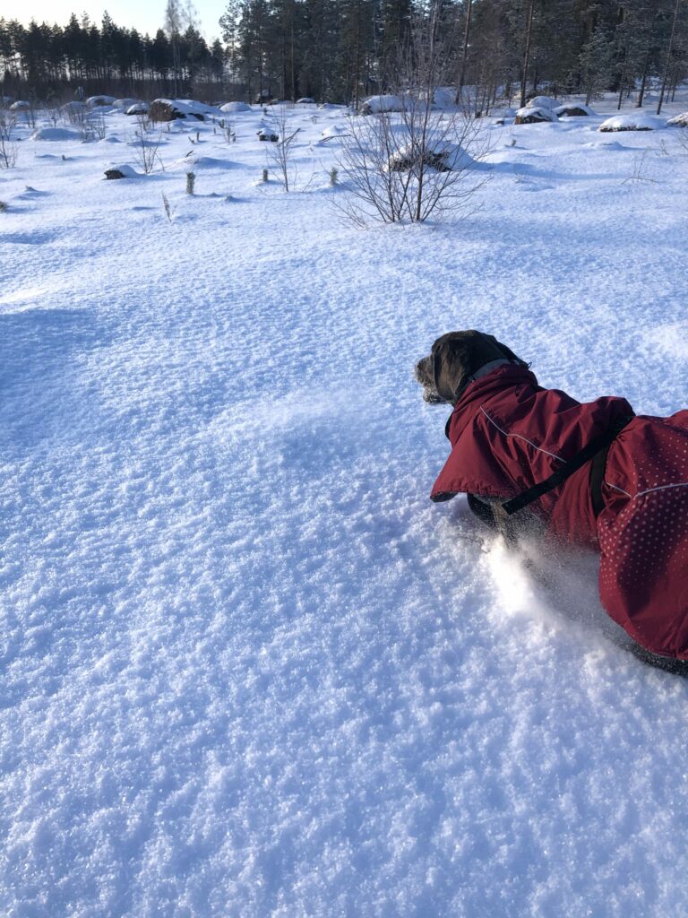 Hangessa tarpomisesta puheen olleen, siirrytäänpäs suoraan sinne metsään! Lumi oli onnistunut pakkautumaan paikoitellen hyvinkin syviksi kinoksiksi, ja parhaillaan me tarvoimme polvea myöten hangessa. Jännä, ettei metsässä ollut kulkenut muita meitä ennen…? Venla sai – ja siis oikeastaan halusi – juosta edellä ja samalla se hienosti rakensi meille perässä tuleville polkua.