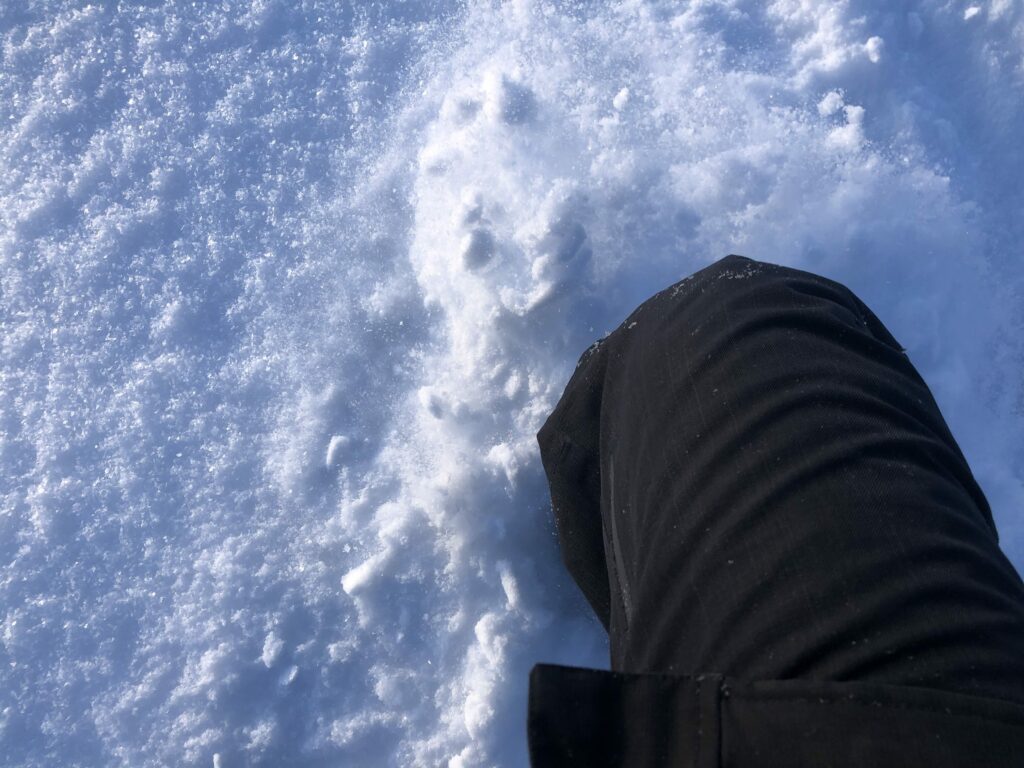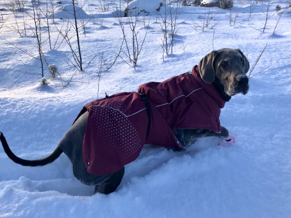 Tossut koiran jalassa ovat aina hankalat – etenkin, jos tarkoitus on lähteä hankeen. Auratulla tiellä tossut ovat tosi jees, mutta hankeen ne saattavat pudota huomaamatta. Ilokseni tossut pysyivät koko lenkin hienosti jalassa – vain hangessa tarpoessa yksi tossu putosi kyydistä. Se on jo saavutus.