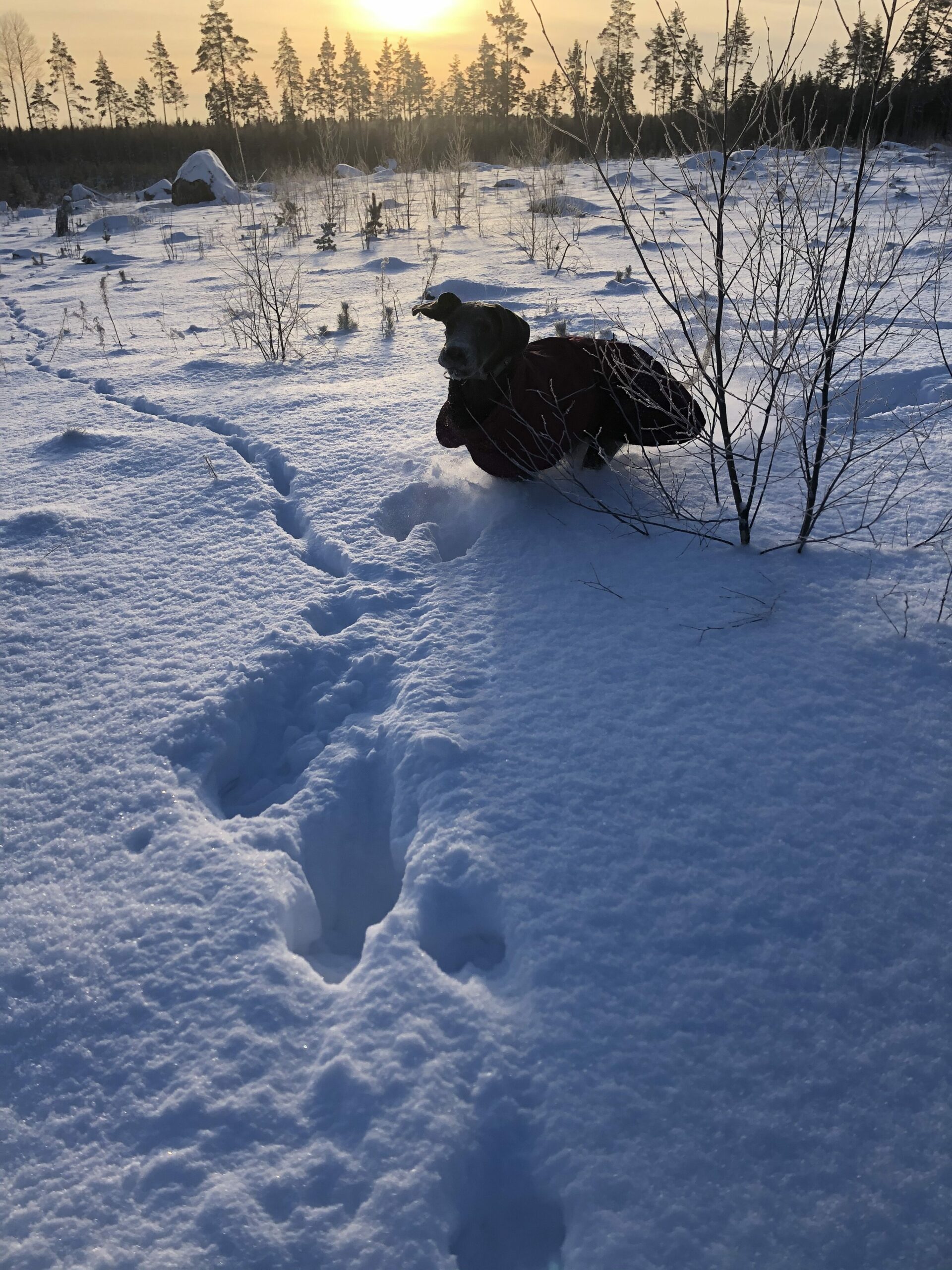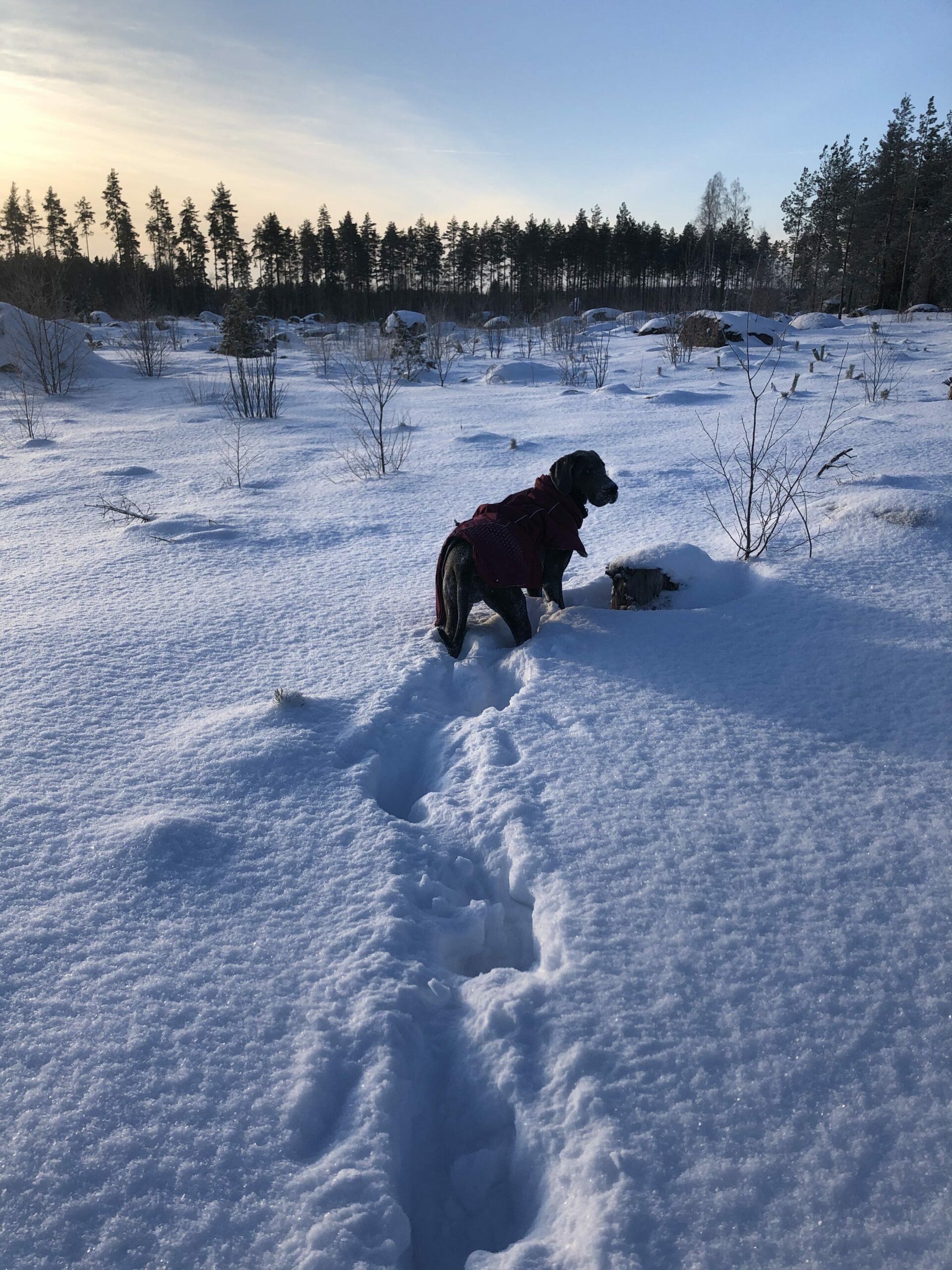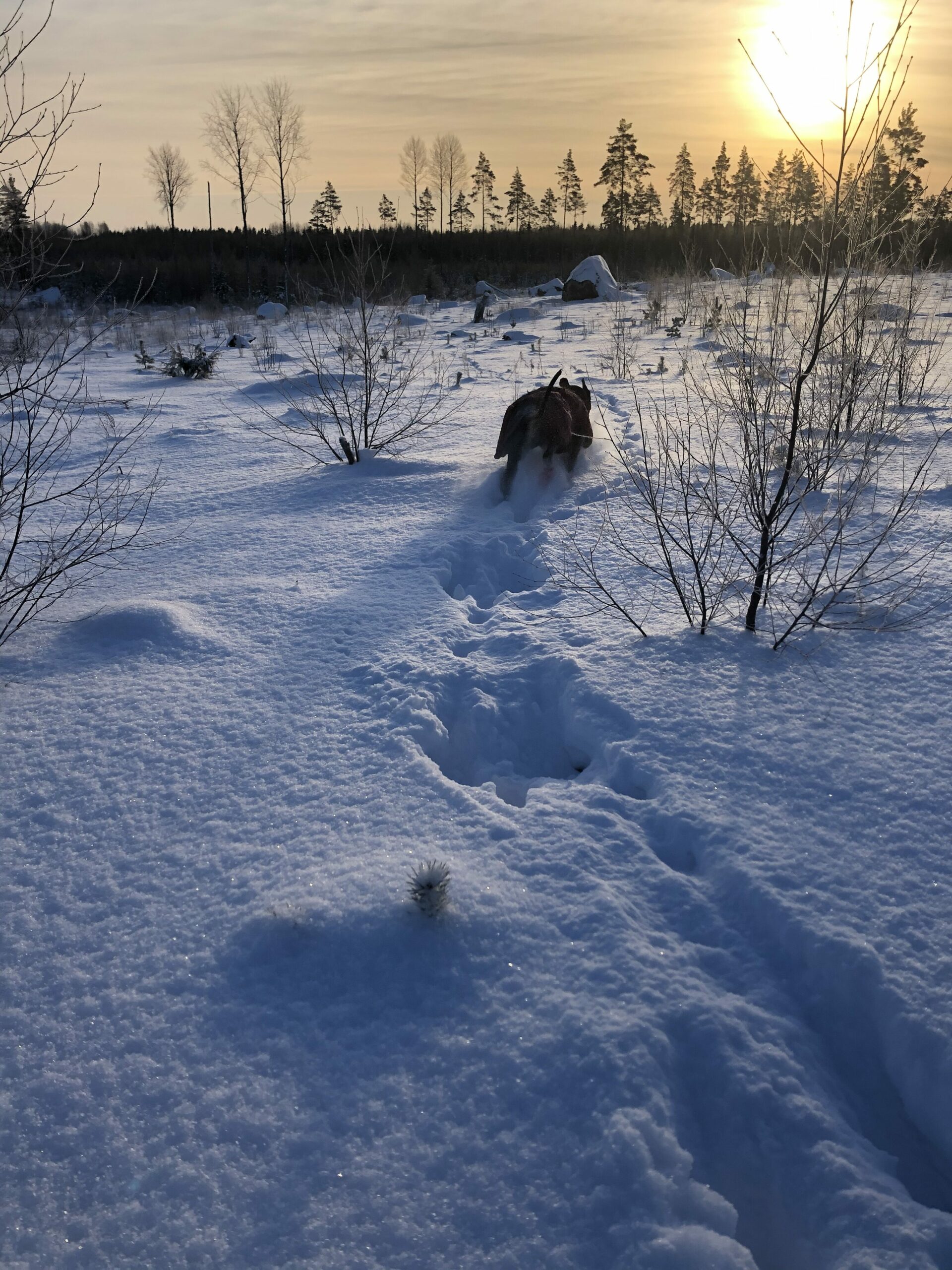 Hangessa tarpomisesta puheen olleen, siirrytäänpäs suoraan sinne metsään! Lumi oli onnistunut pakkautumaan paikoitellen hyvinkin syviksi kinoksiksi, ja parhaillaan me tarvoimme polvea myöten hangessa. Jännä, ettei metsässä ollut kulkenut muita meitä ennen…? Venla sai – ja siis oikeastaan halusi – juosta edellä ja samalla se hienosti rakensi meille perässä tuleville polkua.