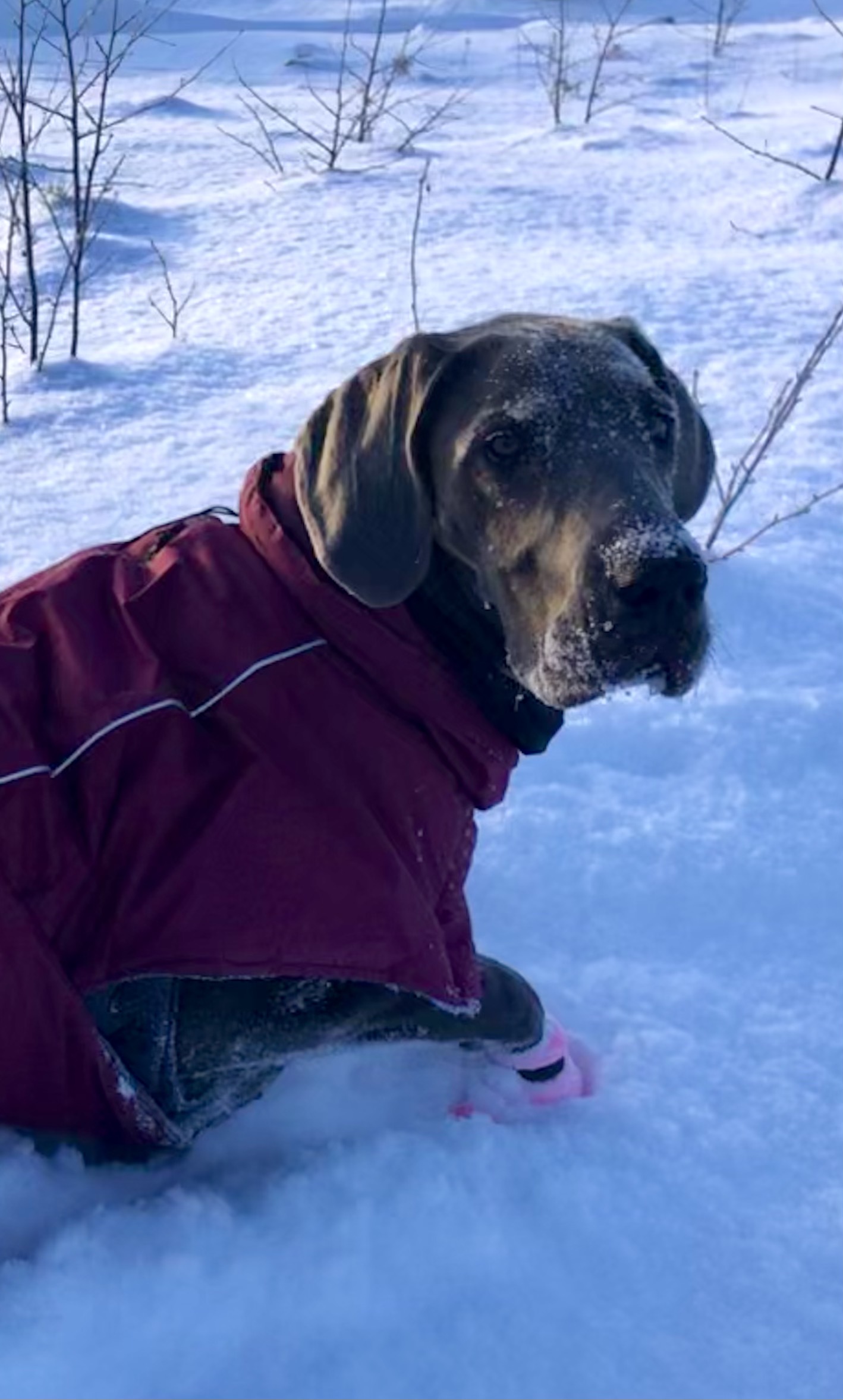 Tossut koiran jalassa ovat aina hankalat – etenkin, jos tarkoitus on lähteä hankeen. Auratulla tiellä tossut ovat tosi jees, mutta hankeen ne saattavat pudota huomaamatta. Ilokseni tossut pysyivät koko lenkin hienosti jalassa – vain hangessa tarpoessa yksi tossu putosi kyydistä. Se on jo saavutus.